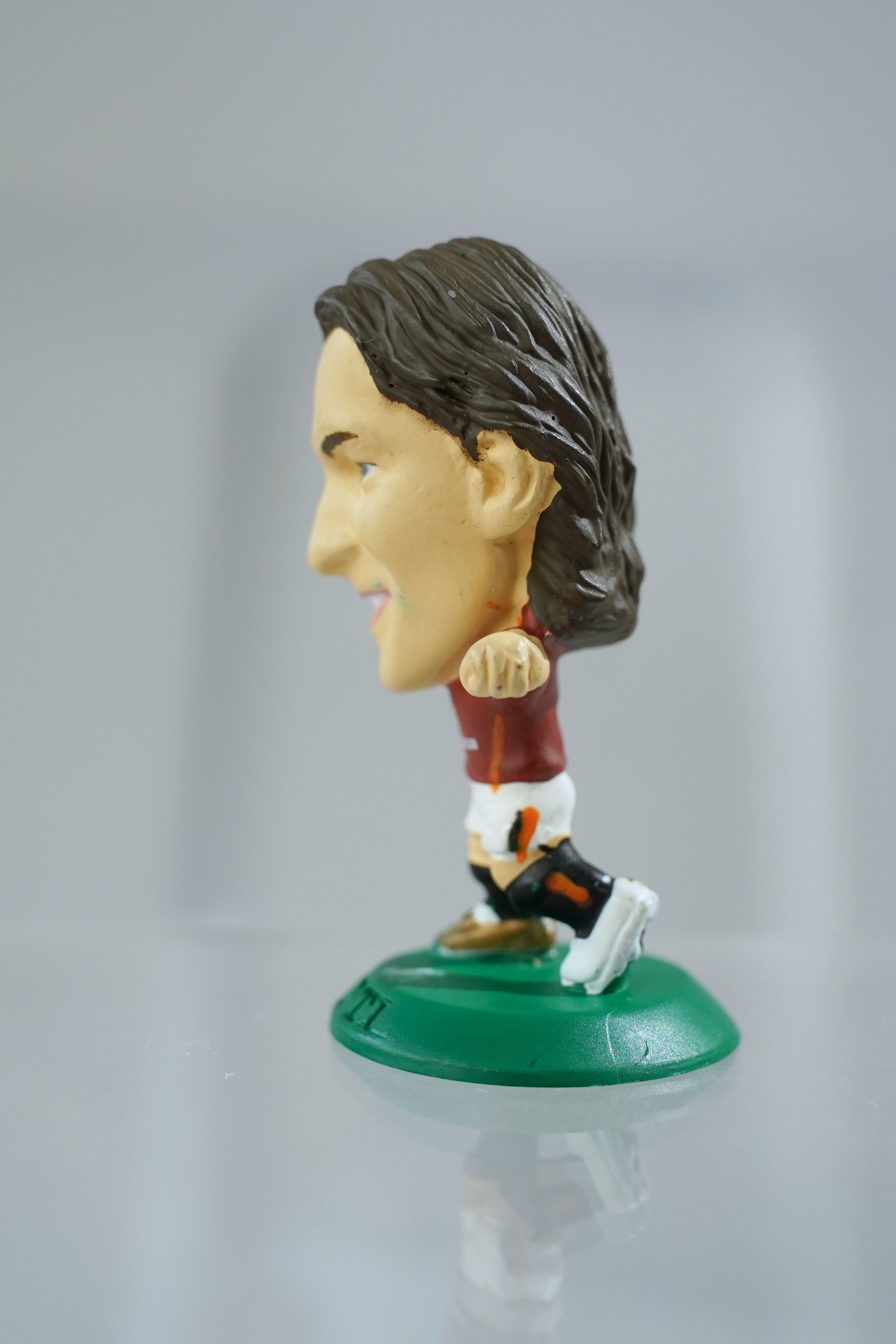 2005年刻印、Collector No. MC3164、グリーン台座仕様。ASローマ伝統の深紅ユニフォームに背番号10を背負った姿を全高約5cmで再現。ファンから“イル・カピターノ(唯一無二のキャプテン)”と呼ばれた存在感が、この小さな造形からも溢れています。