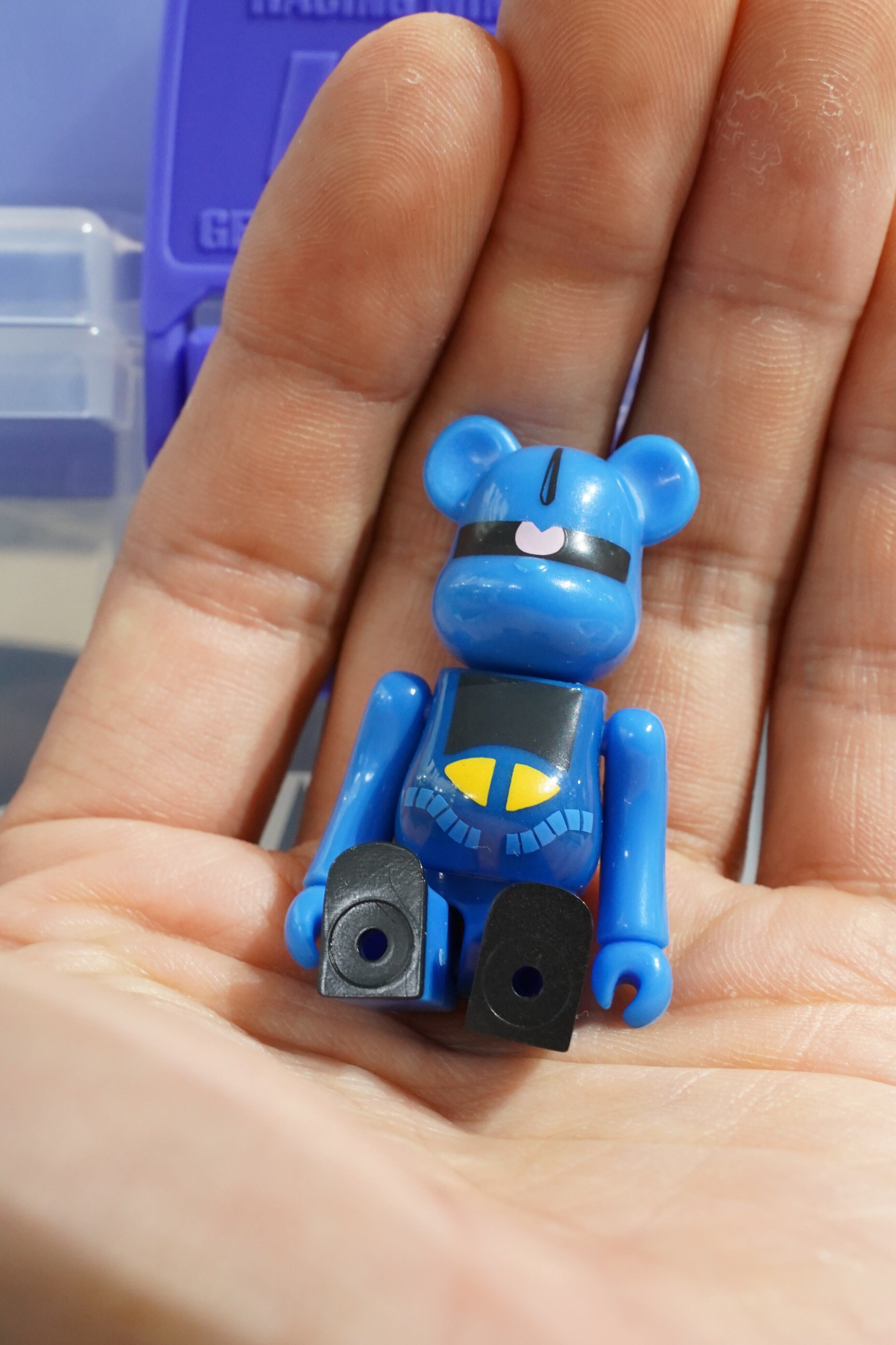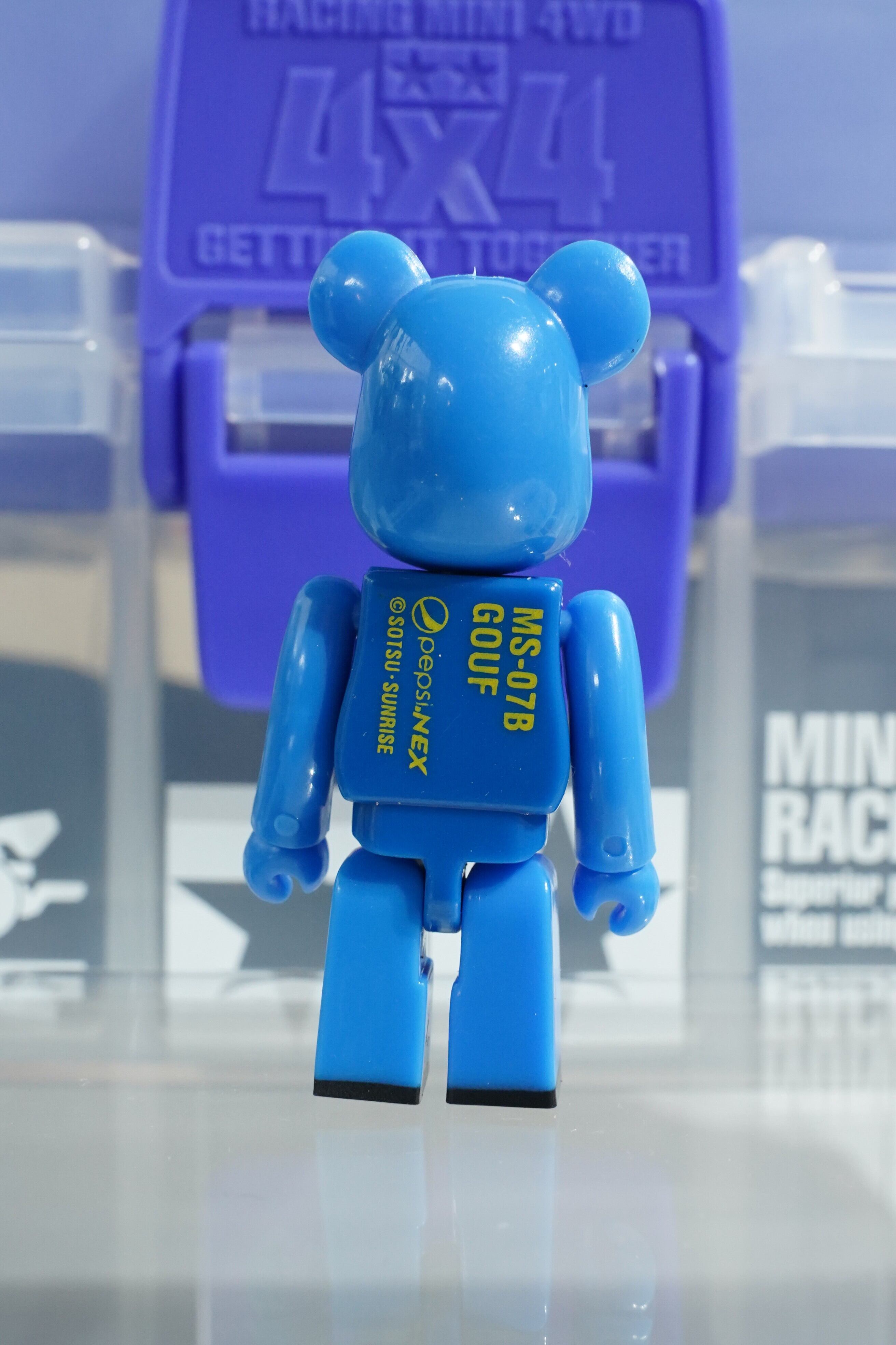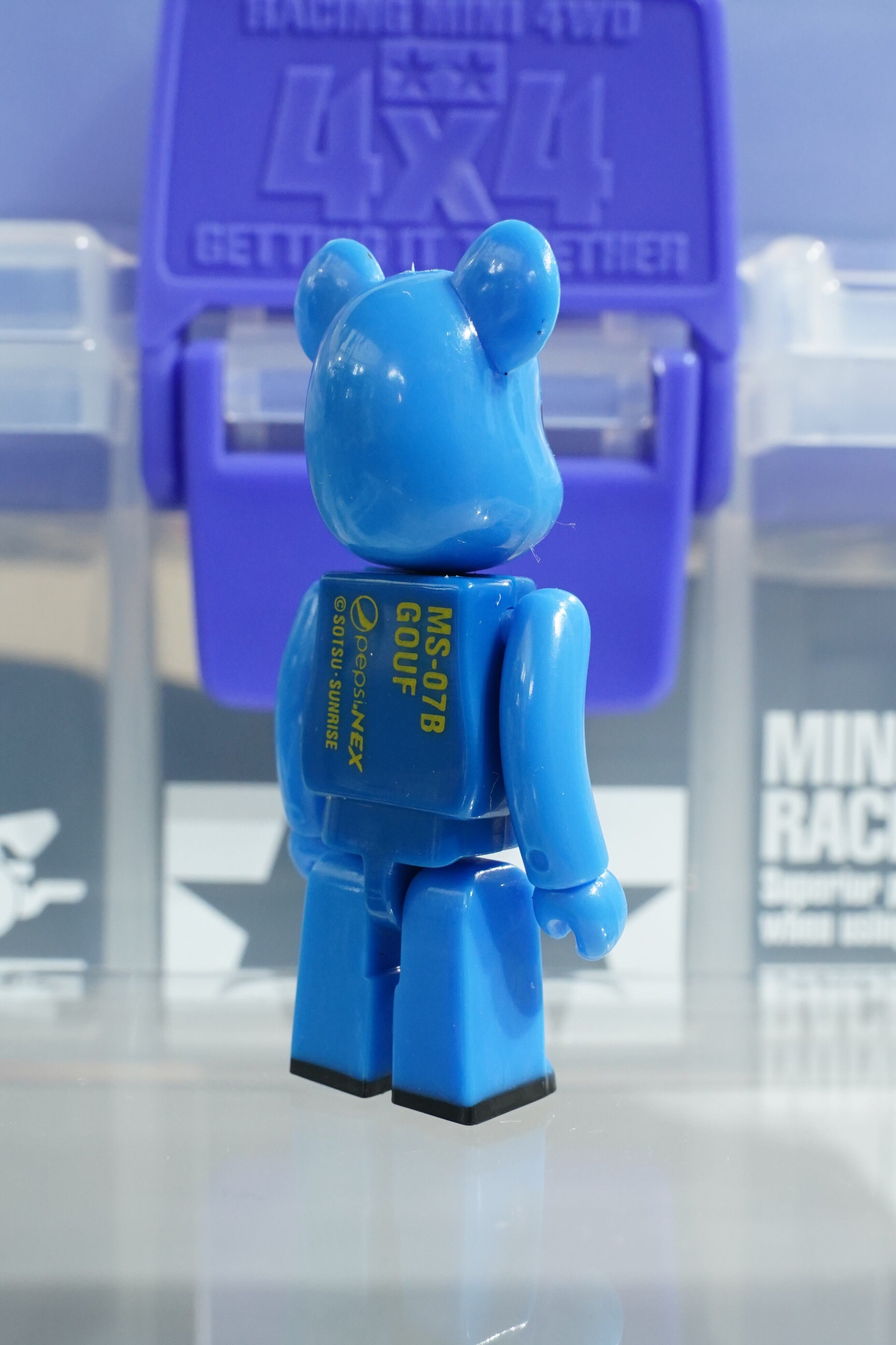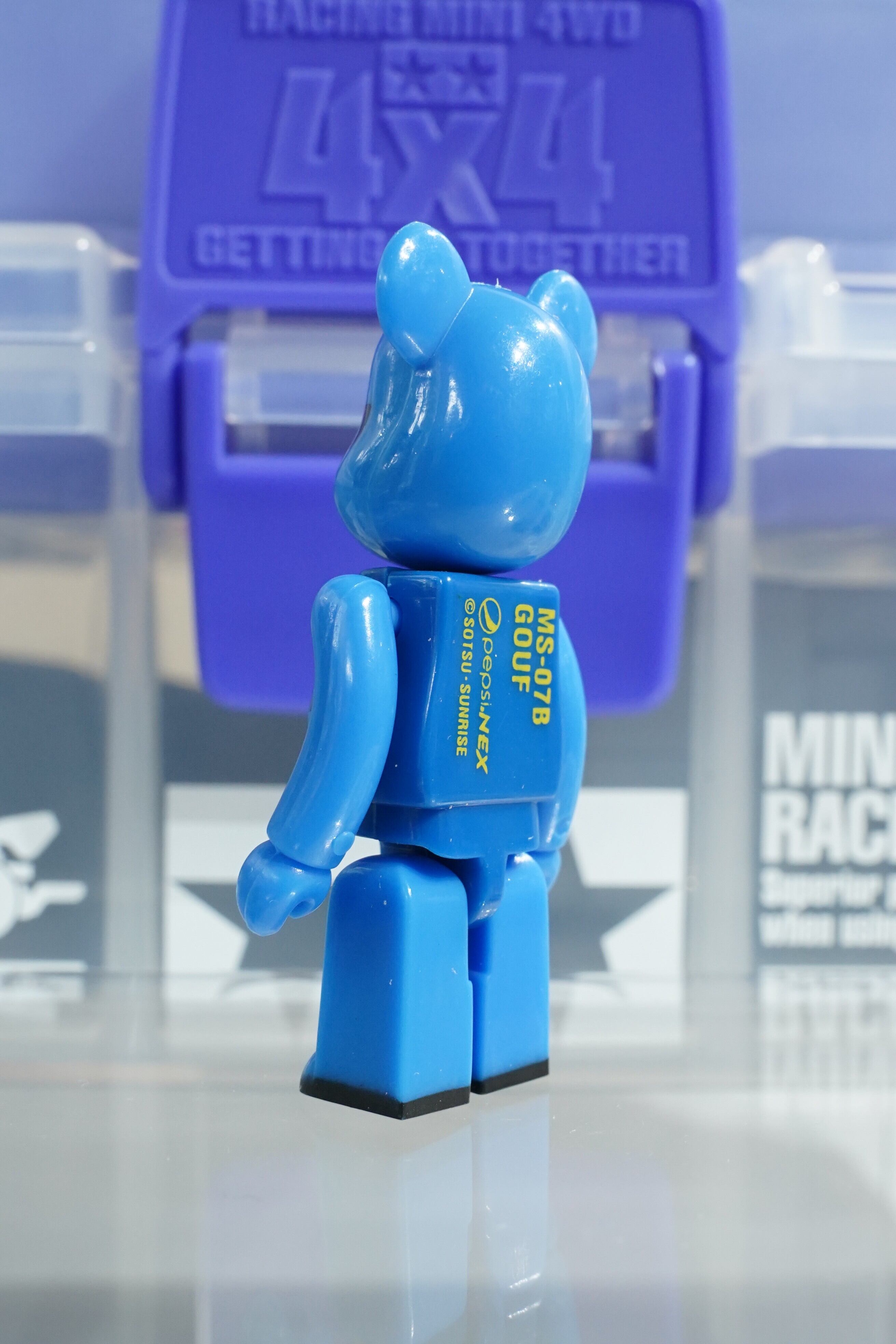 ジオン公国軍の名機「グフ」を象徴する青い装甲と独特のフォルムを、ベアブリックらしいデフォルメで再現しています。