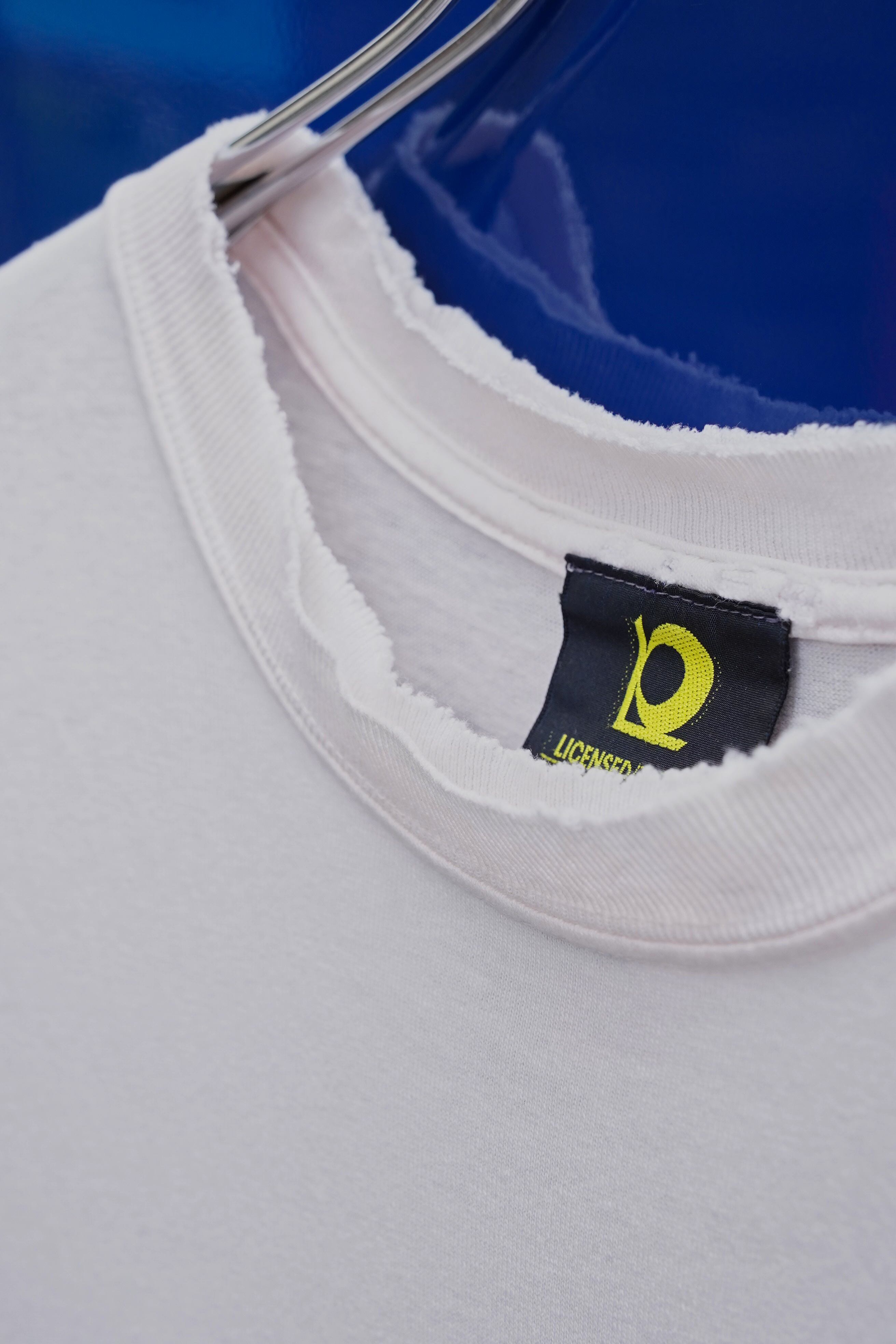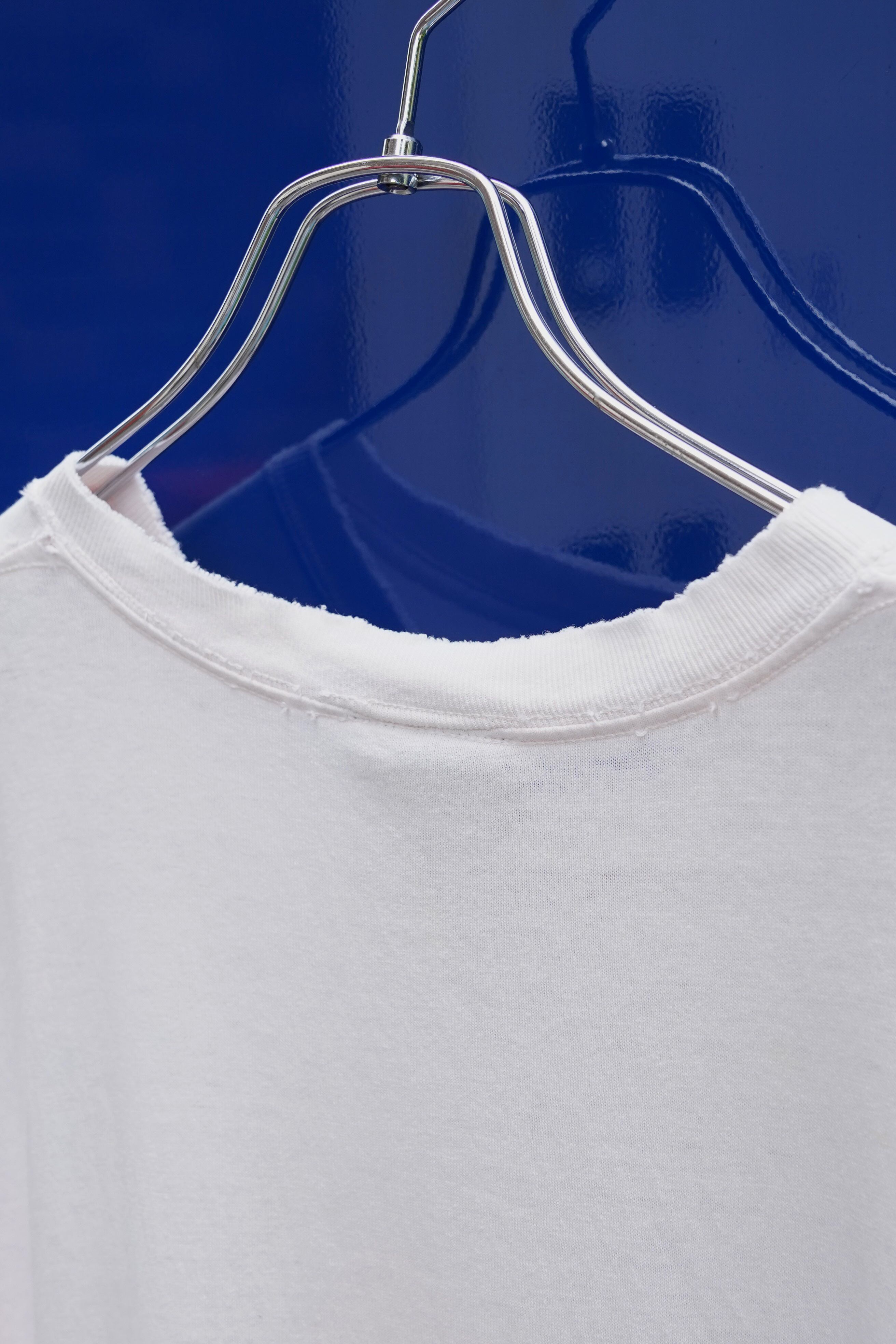 首元、右肩には穴や破けの「良いダメージ」があり、古着特有の“表情”としてデザインを完成させています。