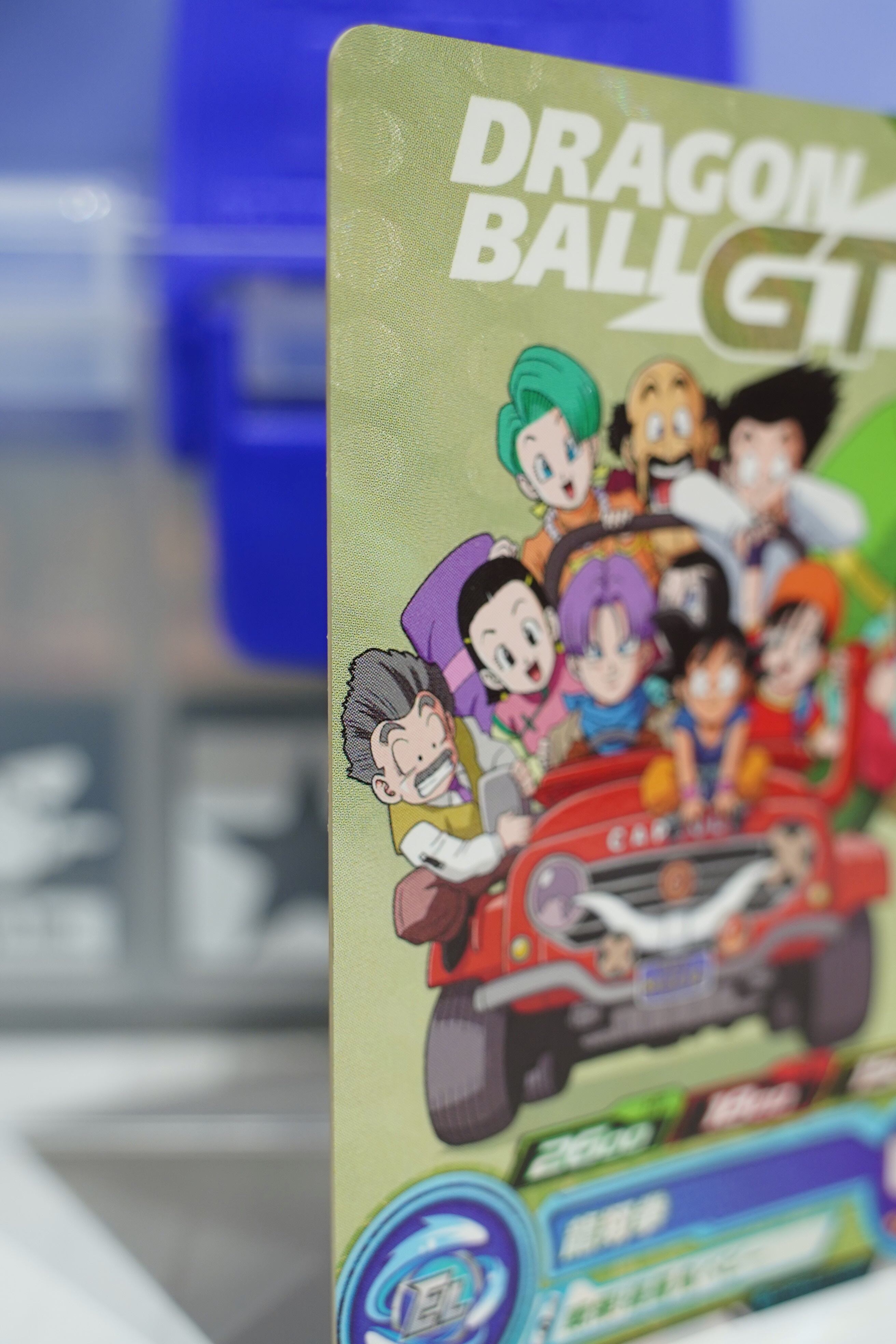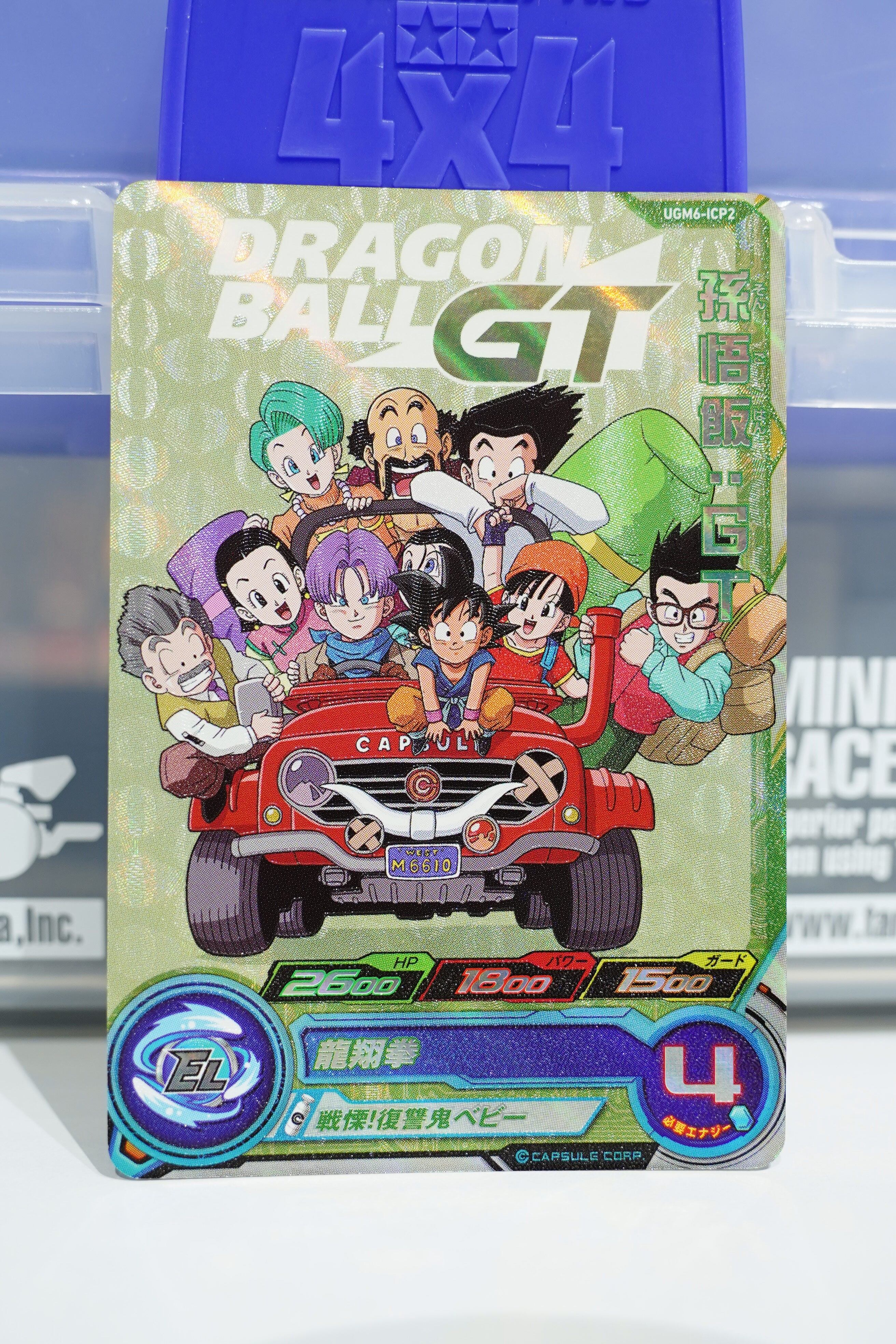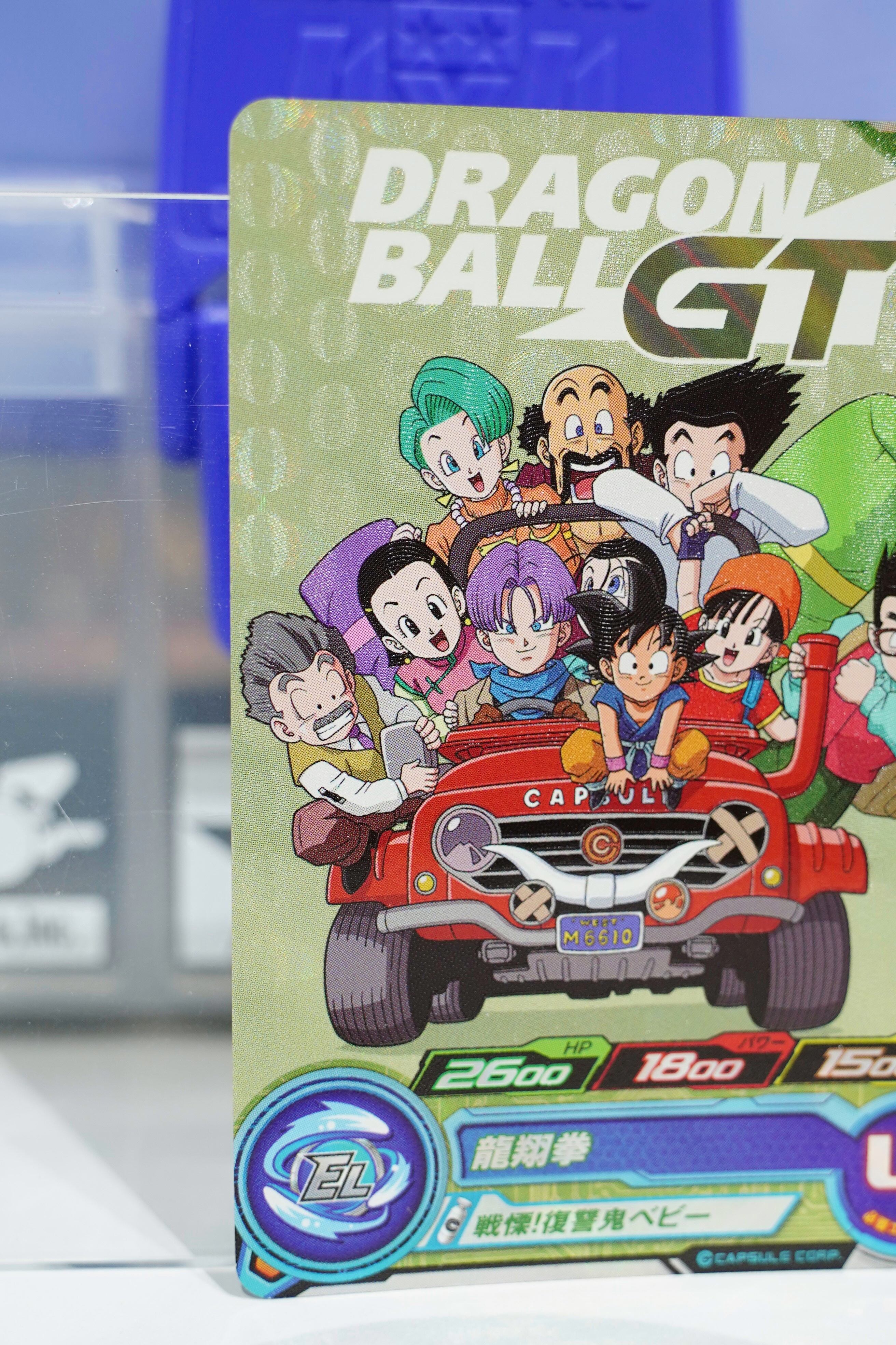 ドラゴンボールGT序盤の冒険を象徴する、悟空・パン・トランクスを中心に仲間たちがカプセルコーポレーションの赤いジープに乗り込んだ名場面イラストが使用された特別仕様。孫悟飯:GTを主役に据えた、プレイにもコレクションにも最適な一枚です。