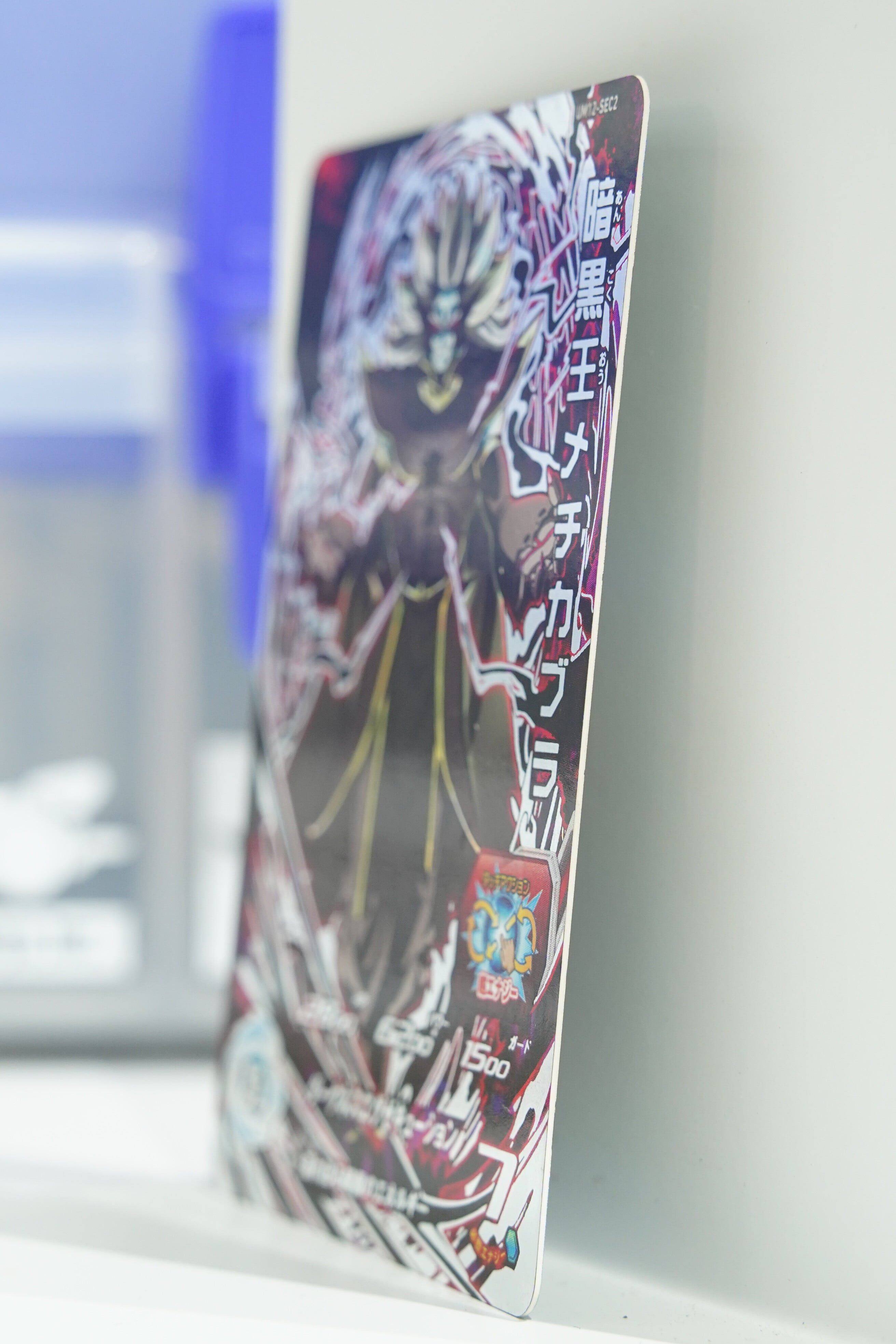 本カードでは、その「力の解放」状態が描かれ、銀白の髪を逆立て、漆黒の衣をまとい、禍々しい魔力を迸らせる姿が迫力あるビジュアルで表現されています。背後には魔界の瘴気のようなエネルギーが渦巻き、必殺技「ダークネスエグゼキューション」の破壊力を視覚化。ホロ加工の赤黒い稲妻が、カード全体を覆うように走り、暗黒王の凶悪な存在感を際立たせています。