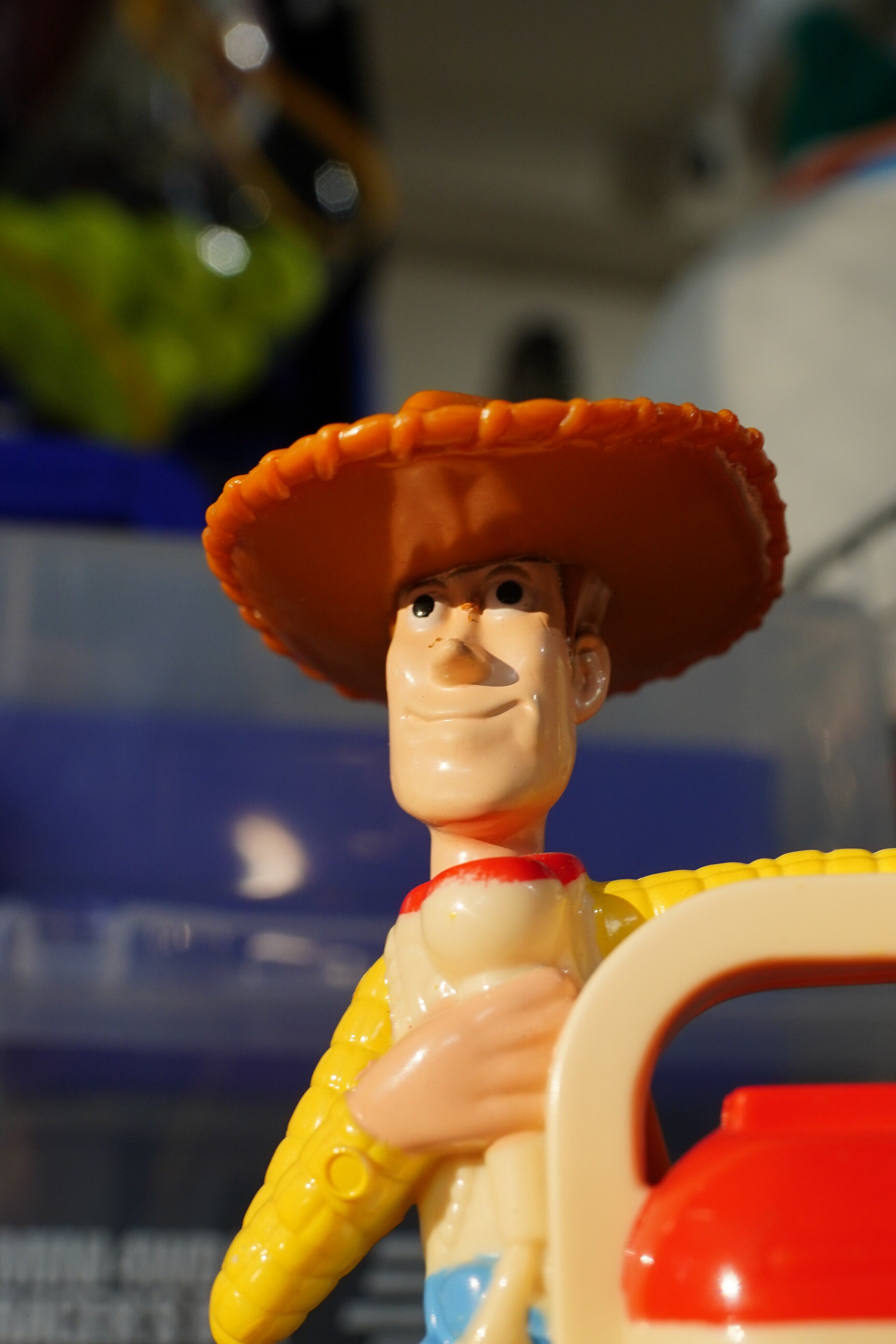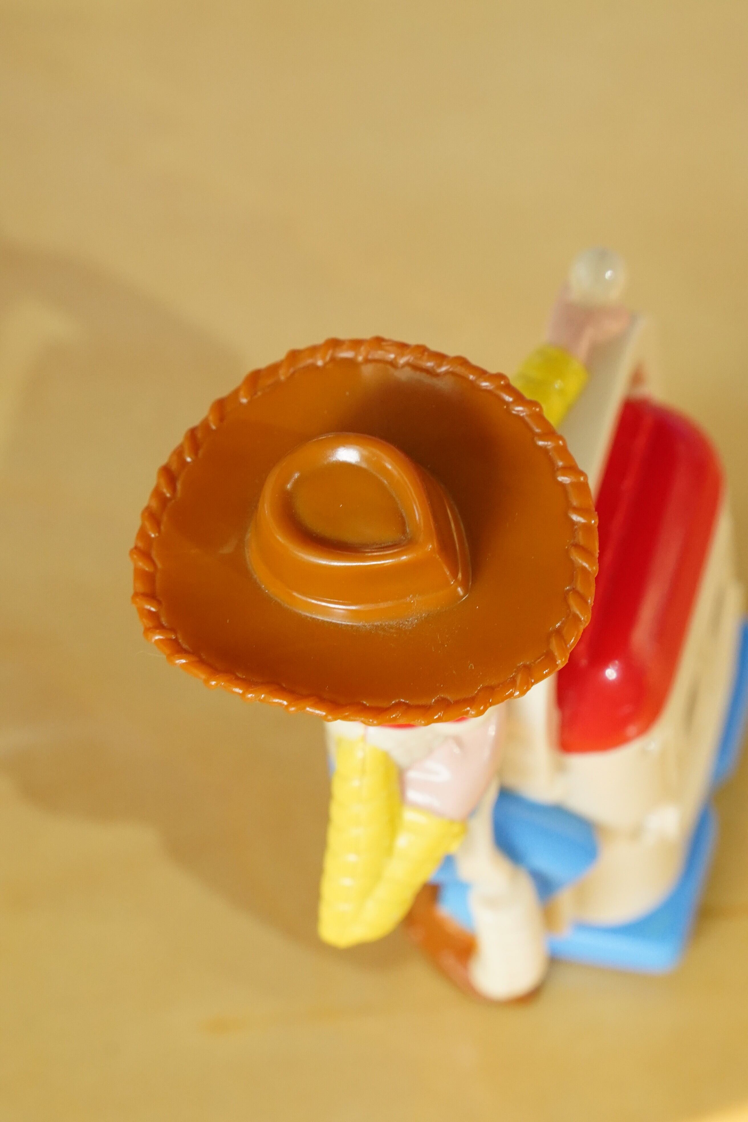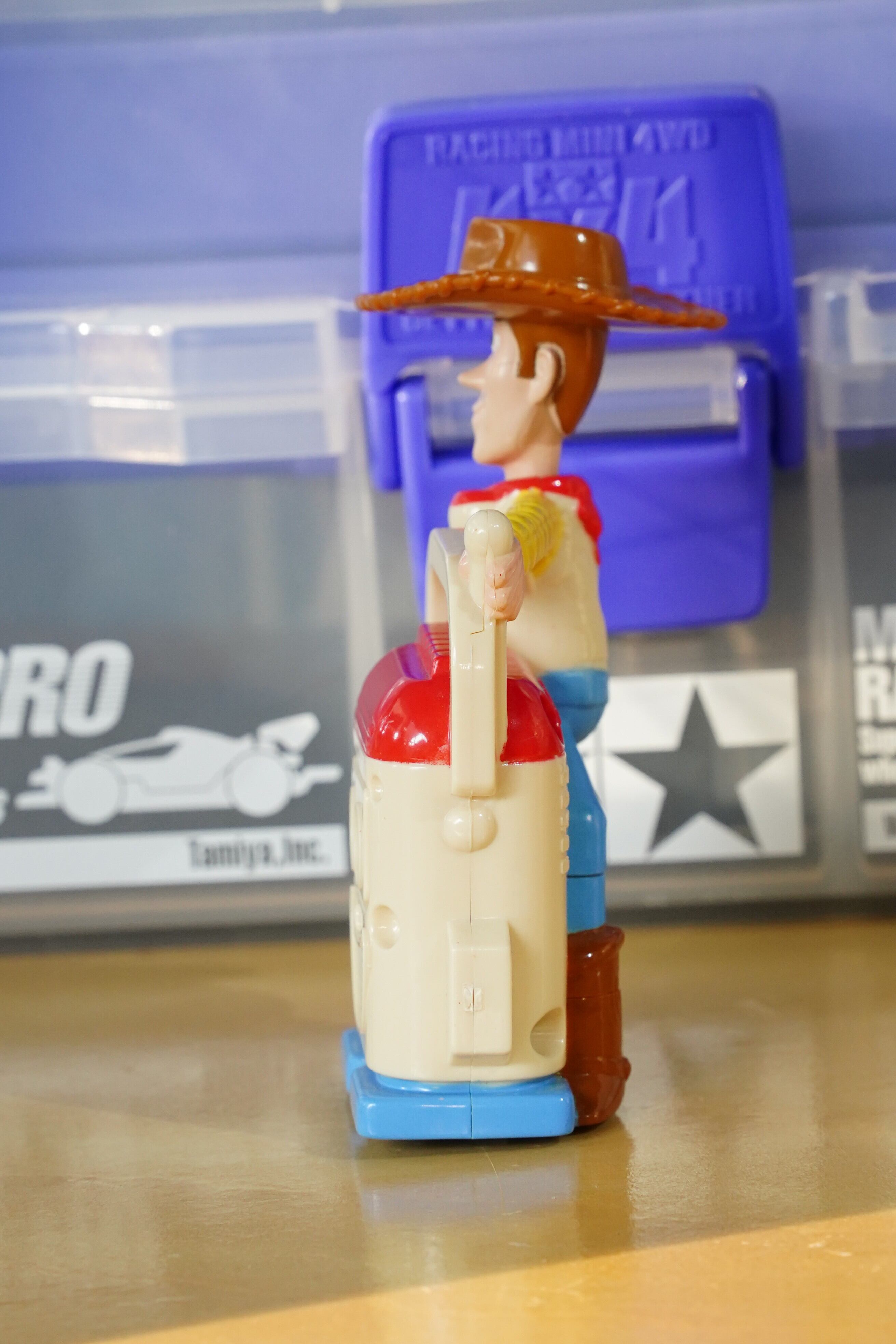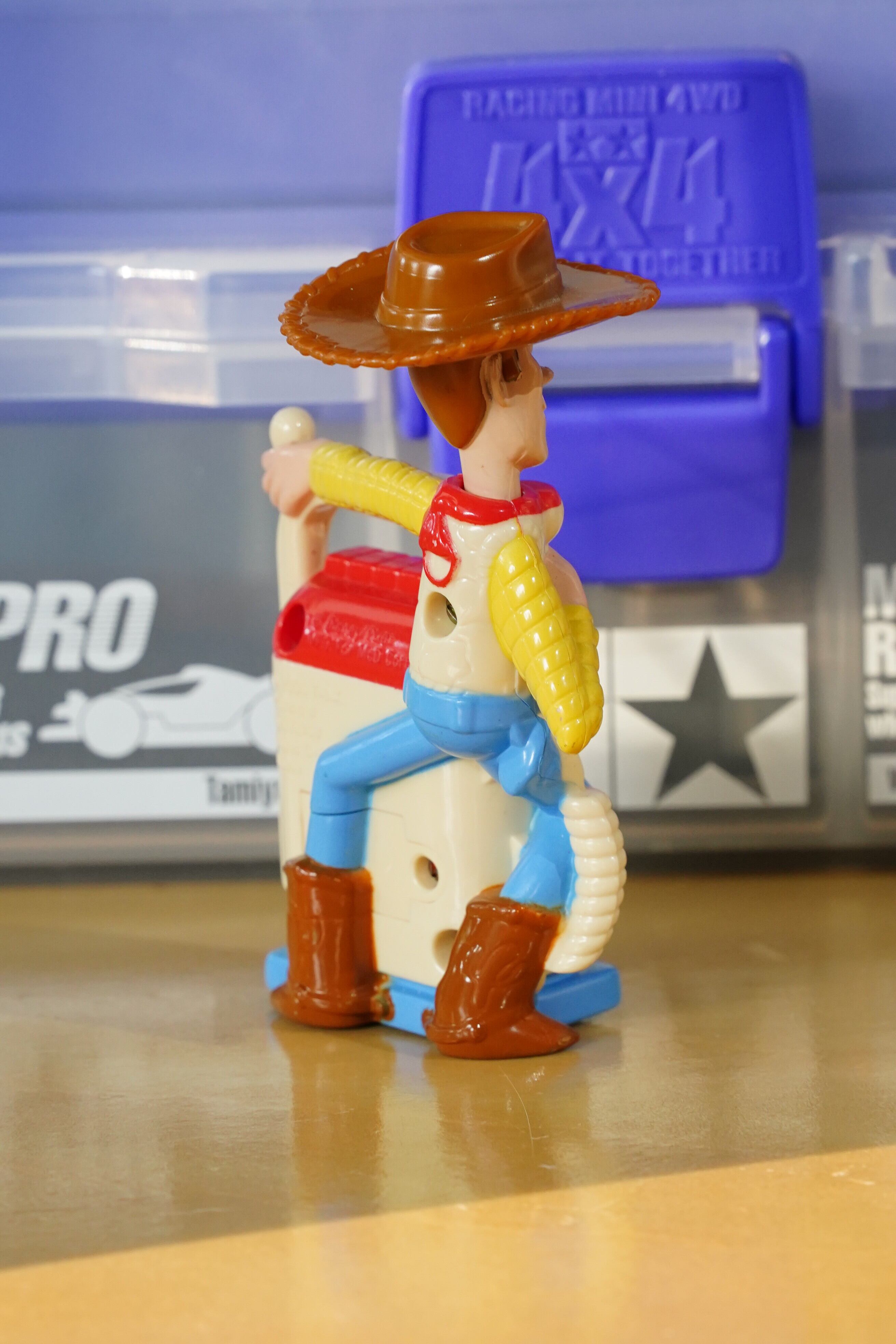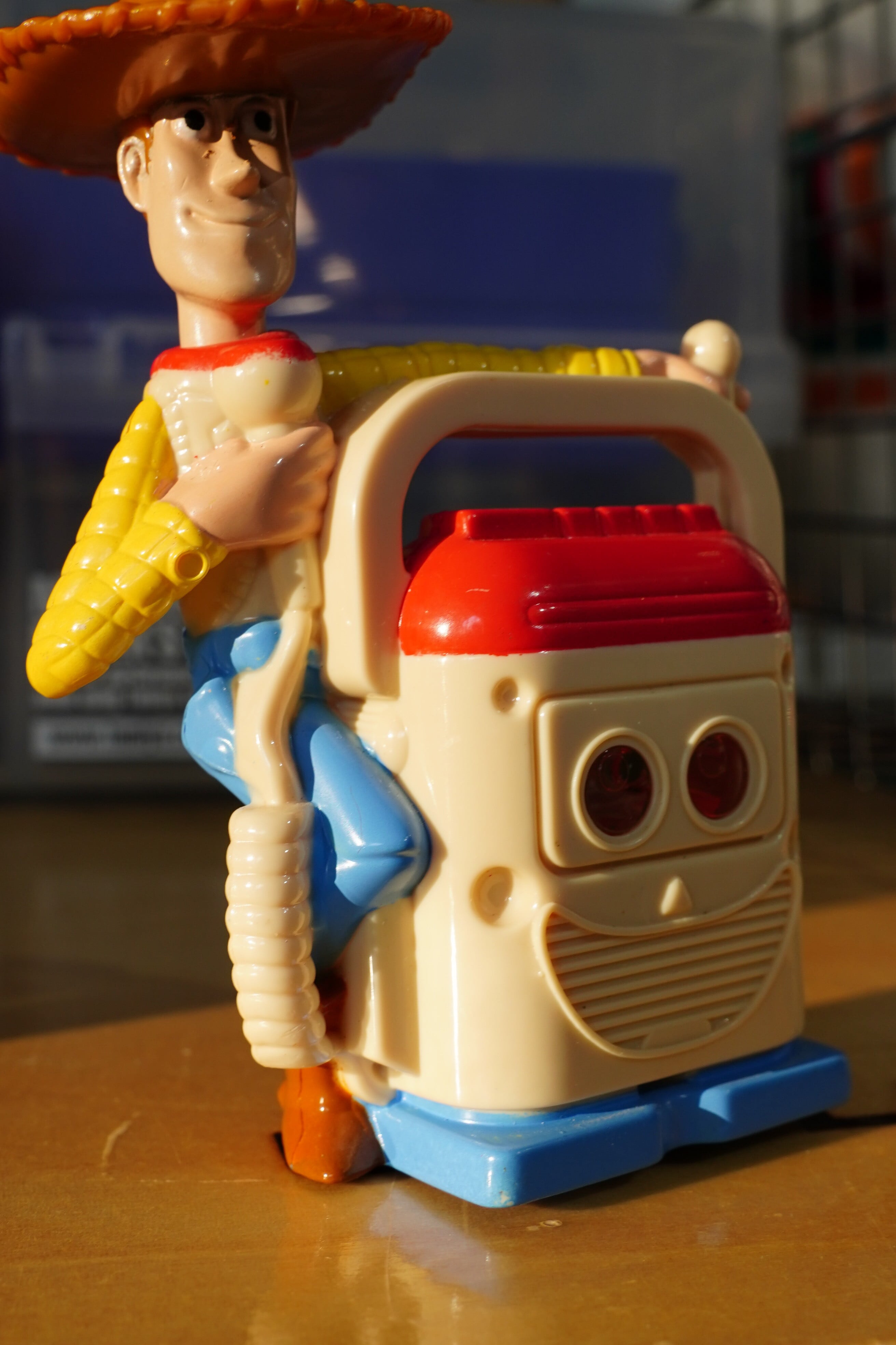 こちらは 2004年にマクドナルドのハッピーセット限定で登場した「トイ・ストーリー」シリーズのウッディフィギュア です。映画『トイ・ストーリー』の主人公ウッディが、マイクを手にスピーカートイに乗ったユニークなデザインで、当時の子供たちに大人気だった一品です。