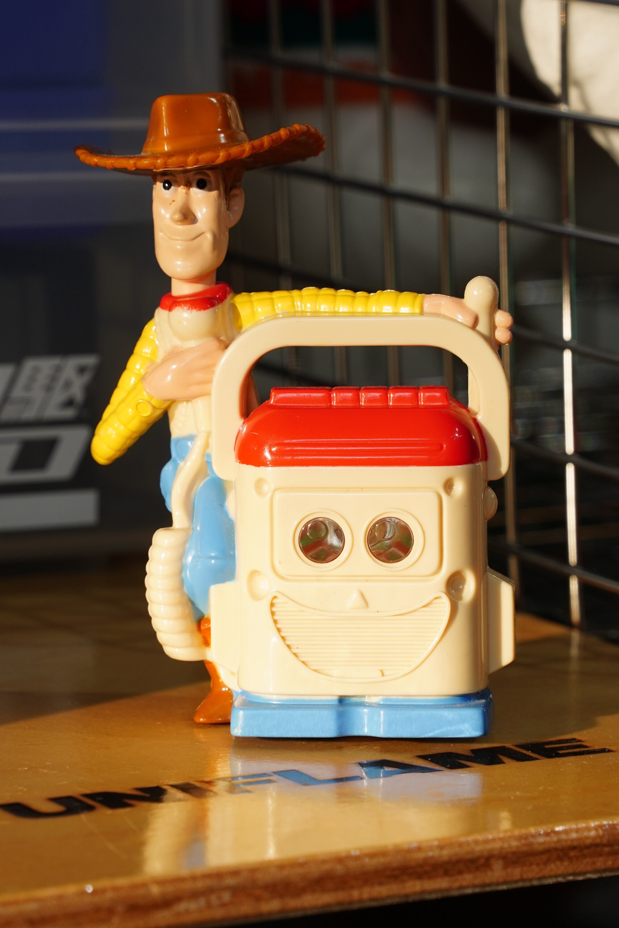 このフィギュアは映画に登場する既存キャラクターではなく、マクドナルドオリジナル企画の「ウッディ&スピーカートイ」。赤いスイッチカバーやスピーカーグリルの造形が、まるで小さなラジオやアンプを思わせるデザインで、コレクションに加えるとシリーズの遊び心が際立ちます。