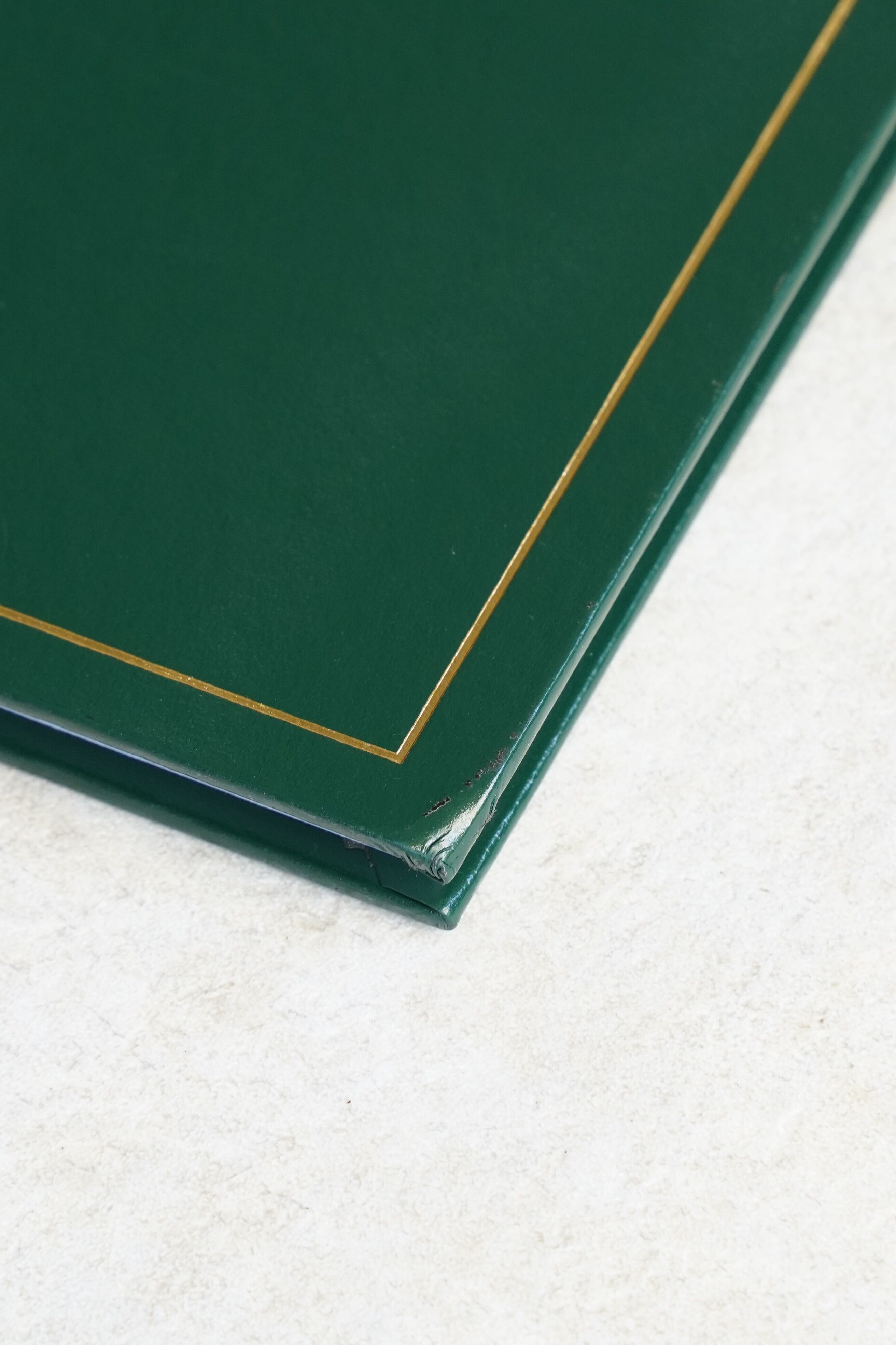 ・表紙と背表紙はしっかりしていて、高級感あるレザーフィニッシュ調カバーと金箔ロゴがきれいに残っています。