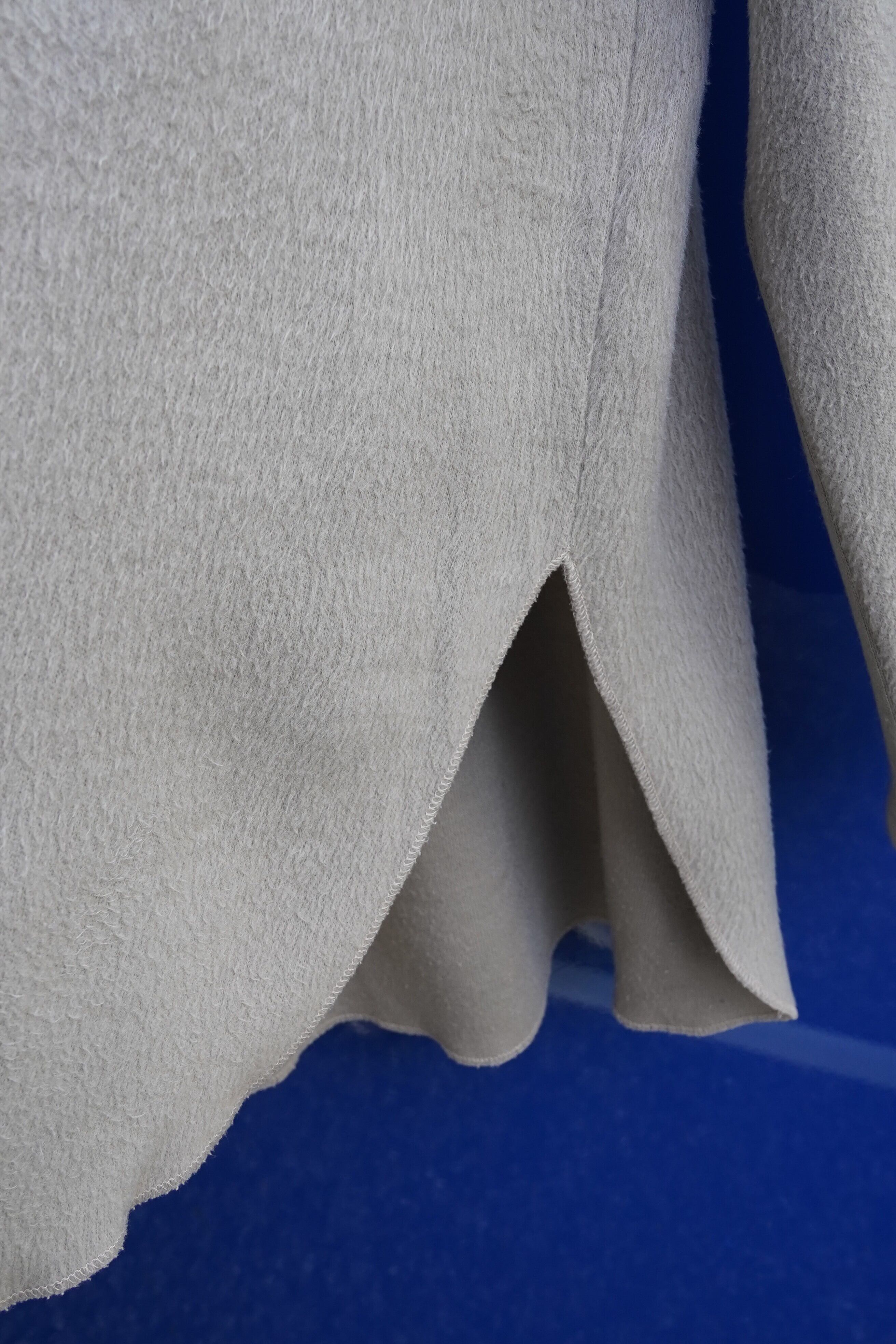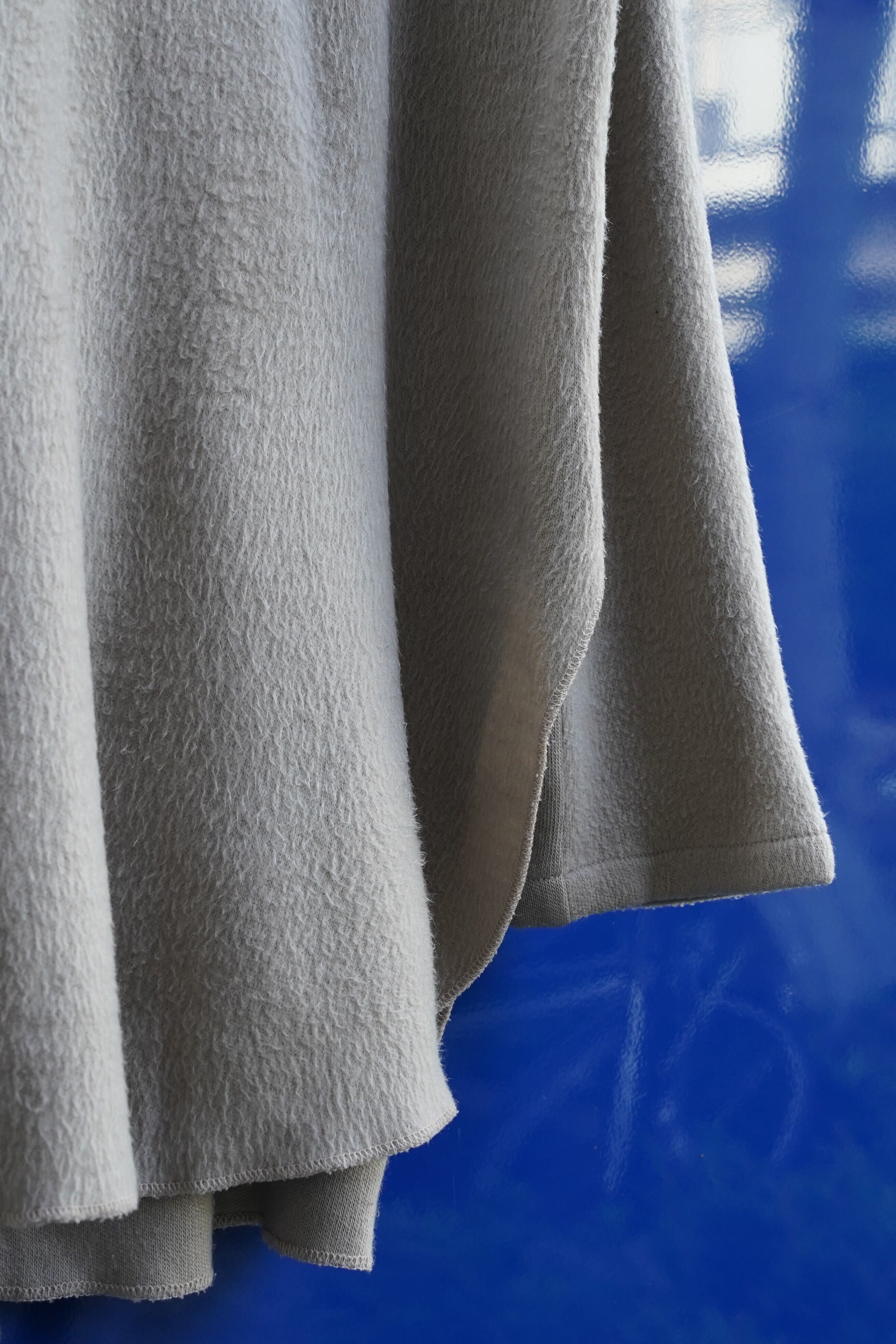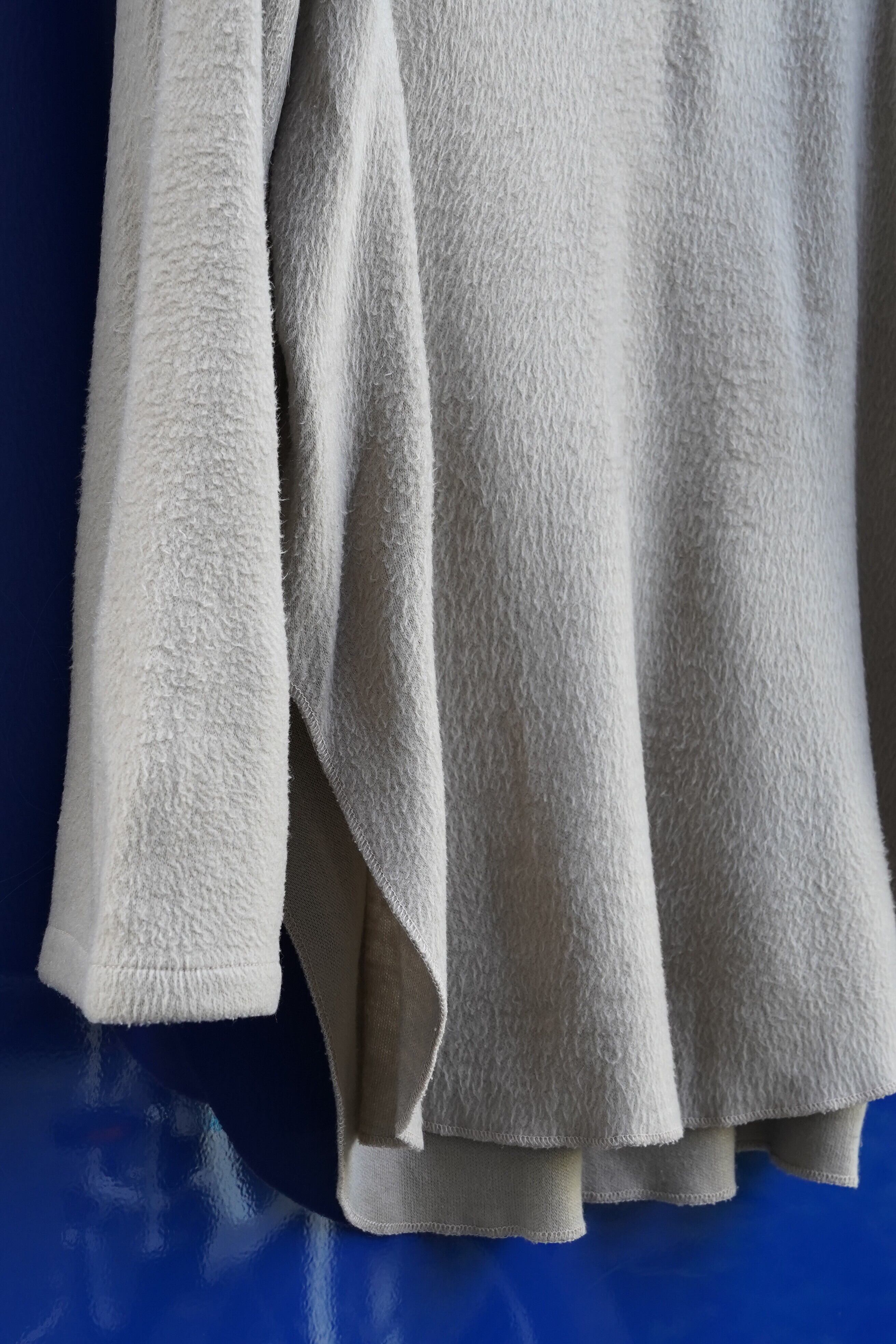 柔らかく起毛した生地と、前後差のあるゆるやかなシルエットが特徴的な一着です。