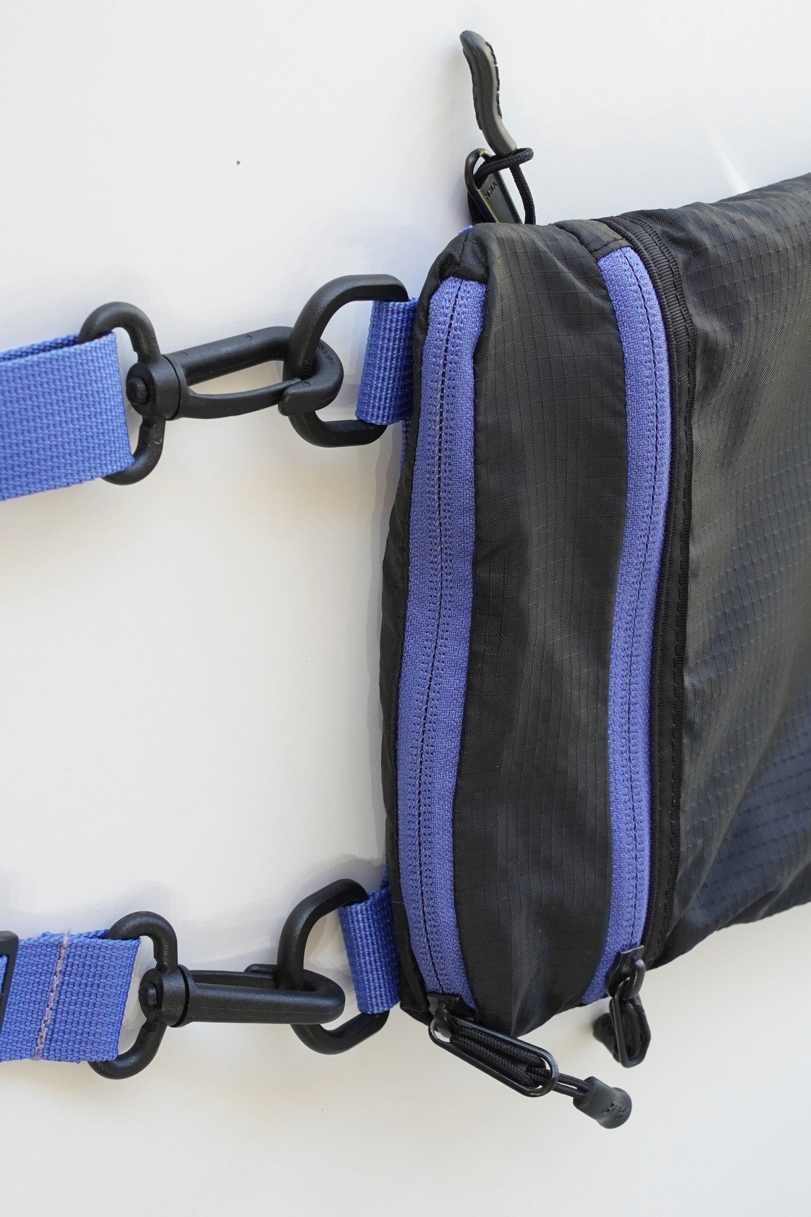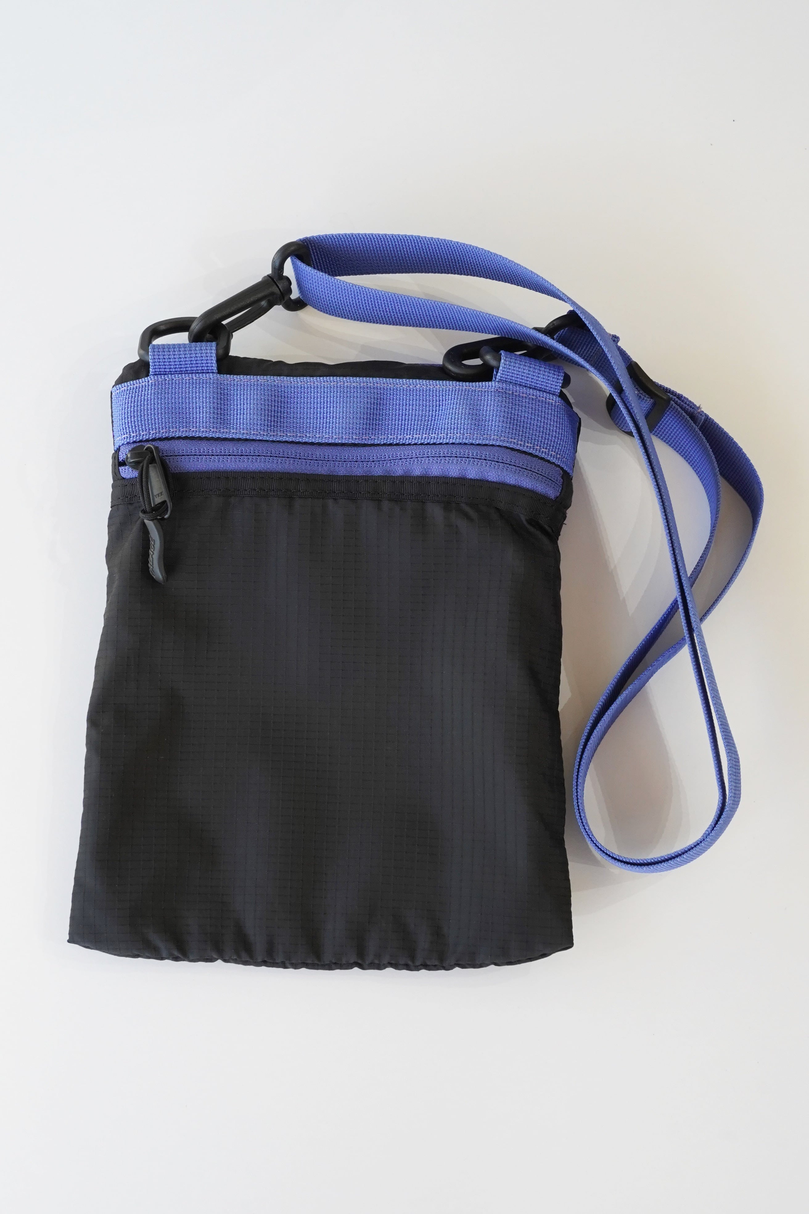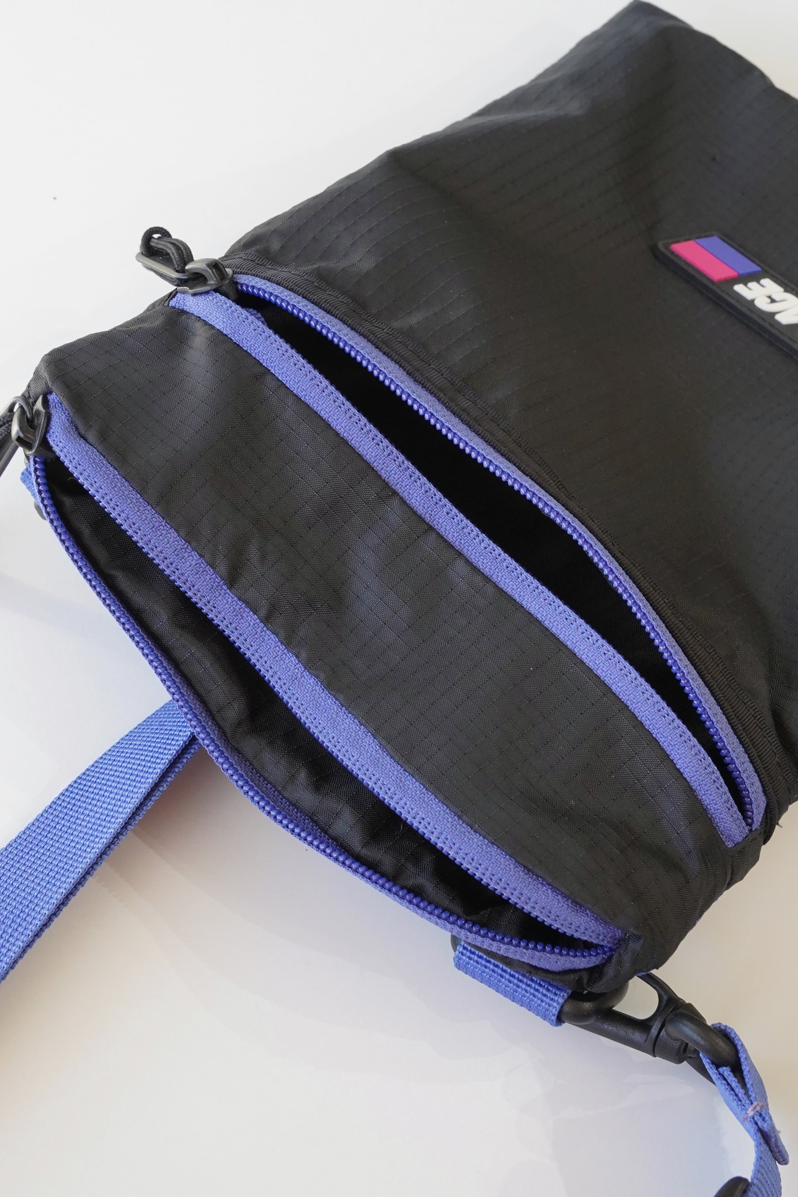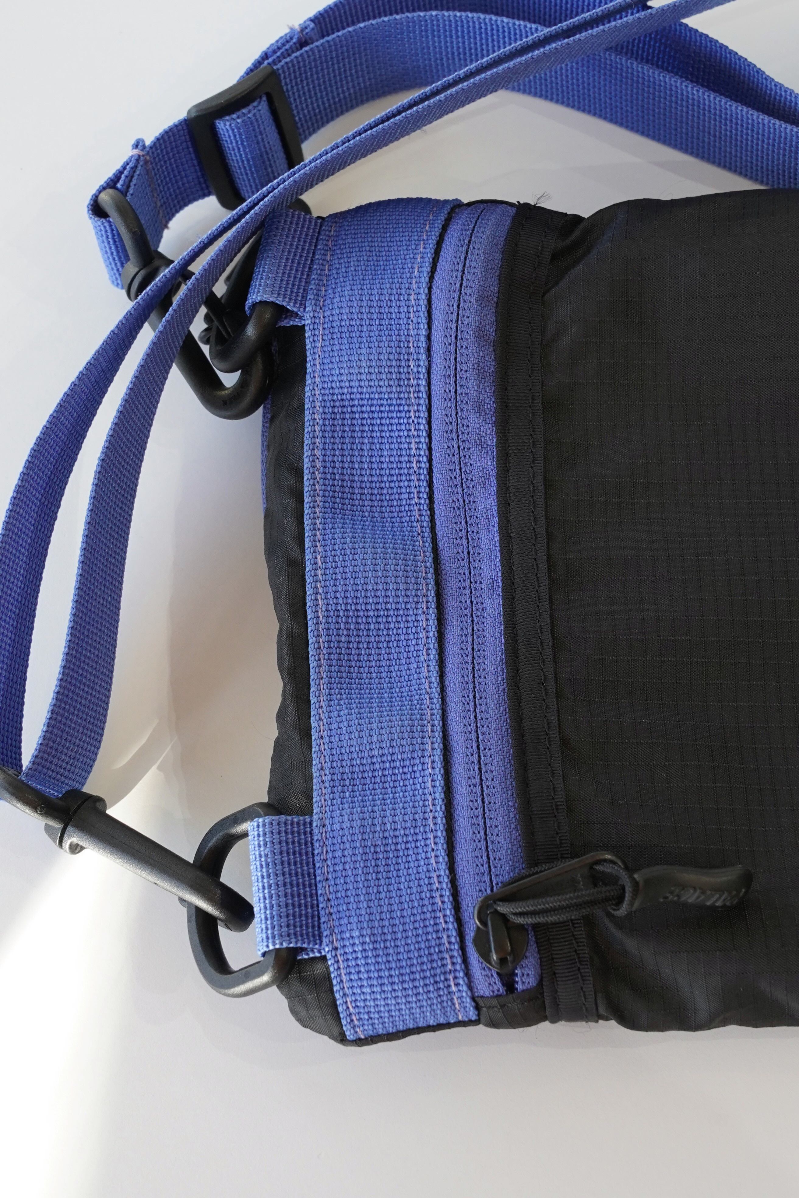 ブラックのリップストップナイロンに、鮮やかなブルーのストラップとジップテープを合わせた当時特有の配色。