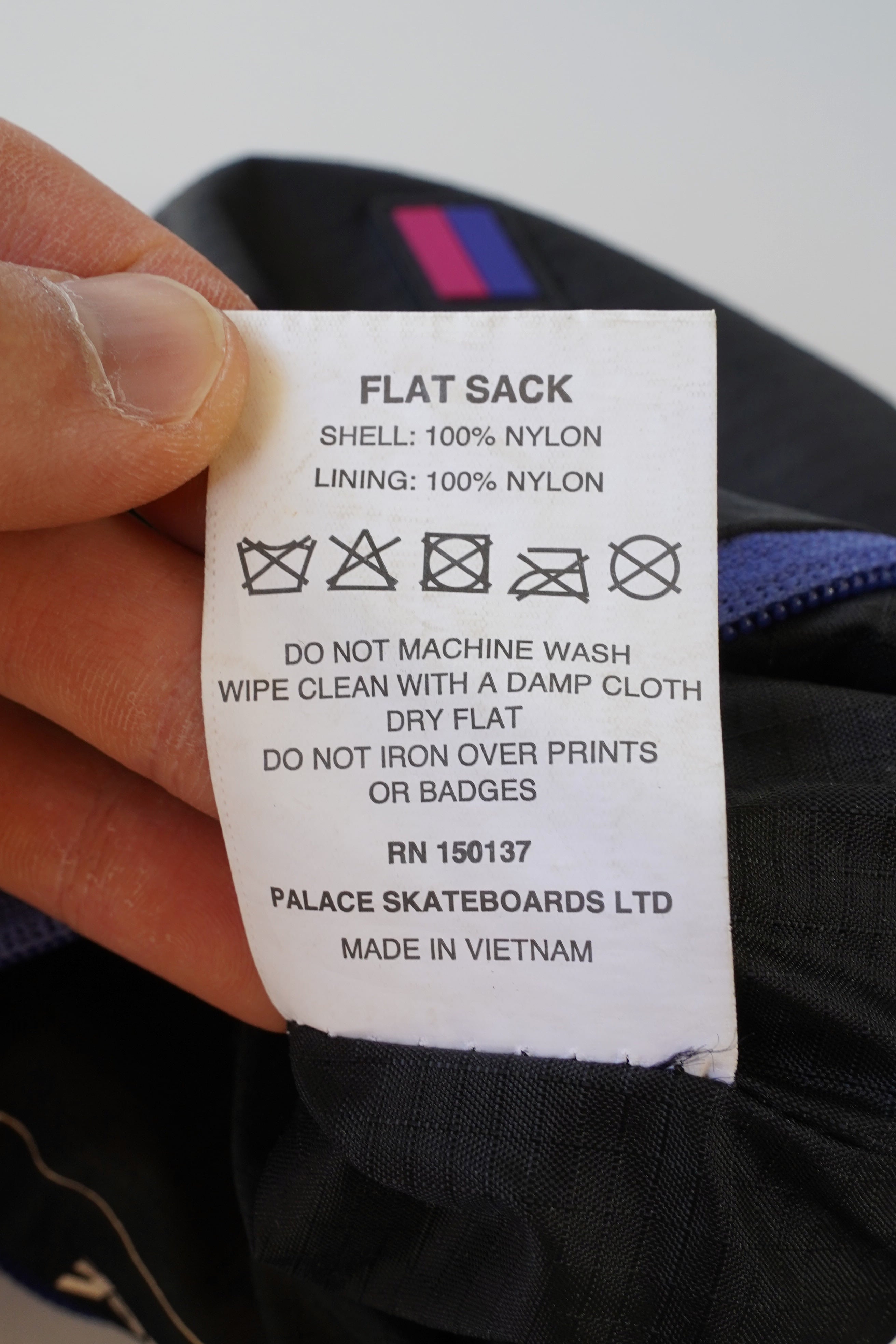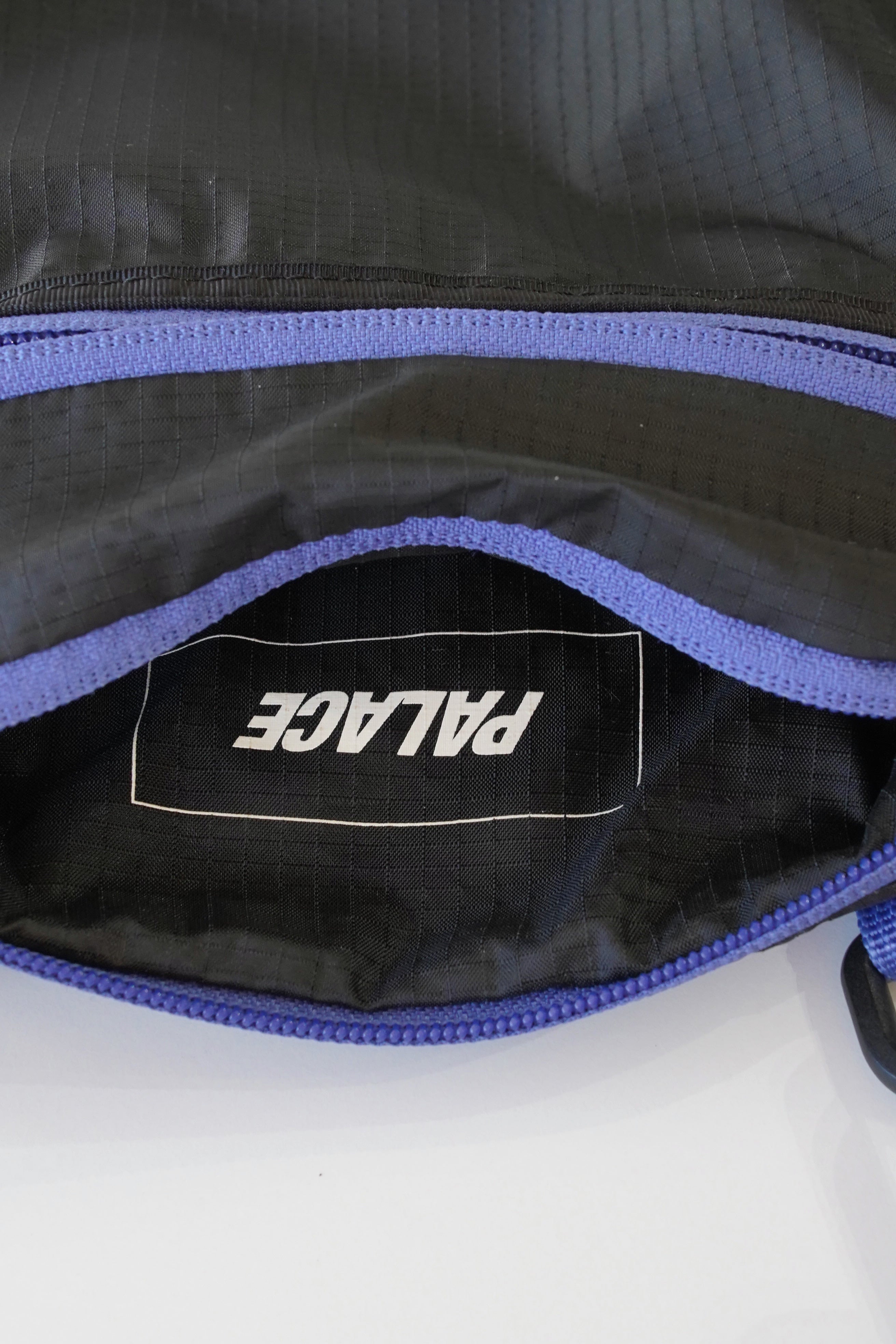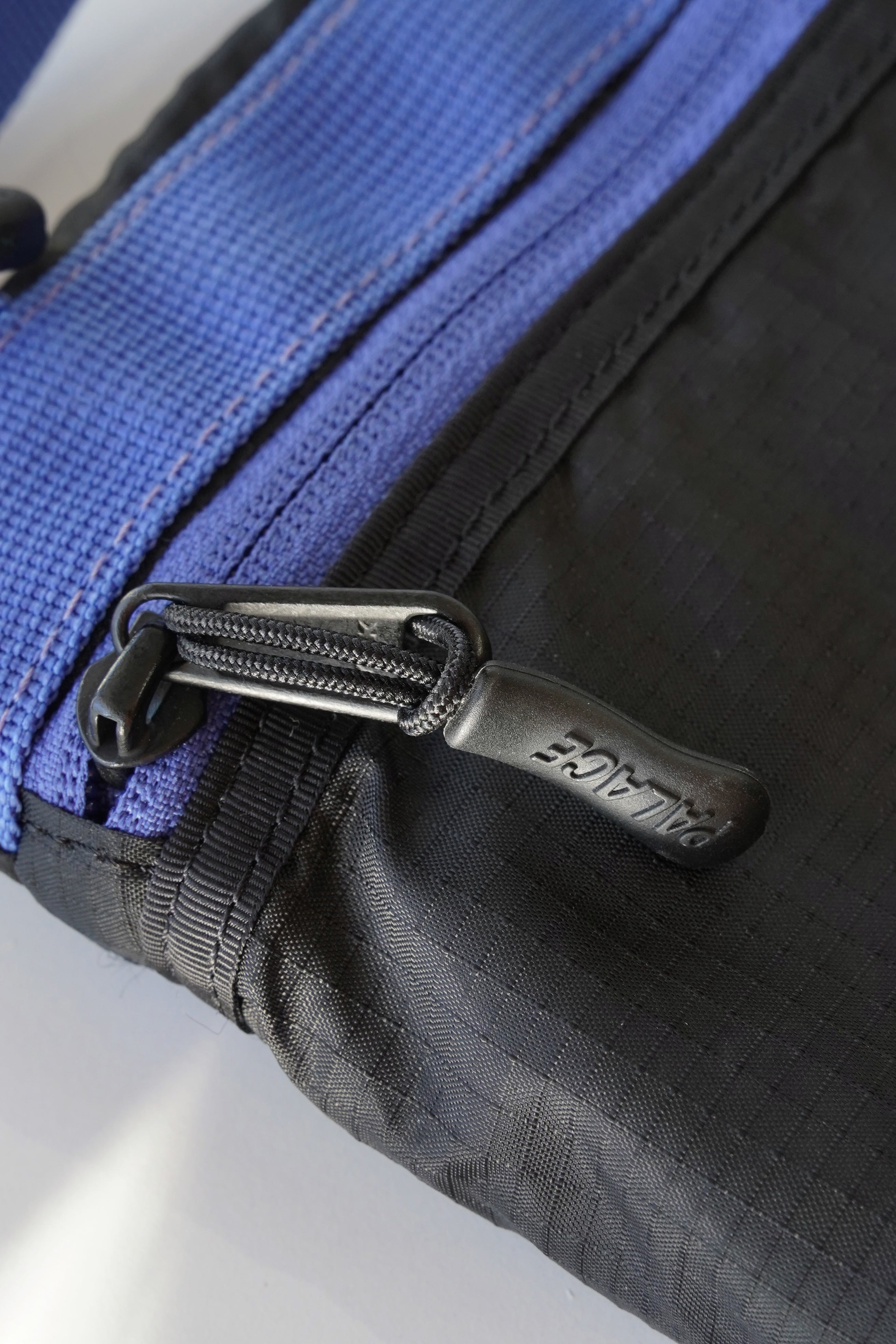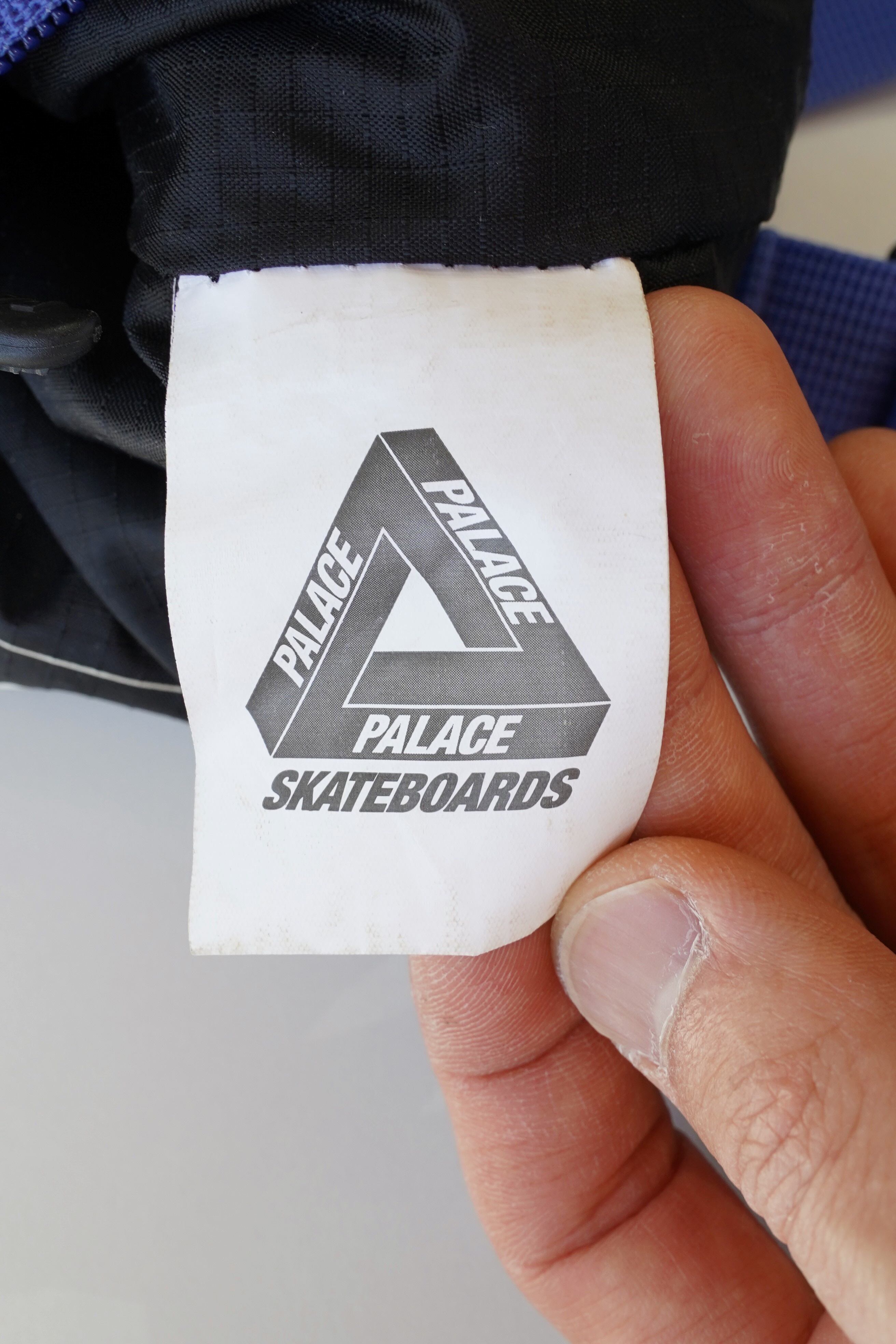 正面には PALACE ロゴワッペン(ピンク×パープルの2トーン)、ジッパーにはブランドロゴ入りプラーを使用。