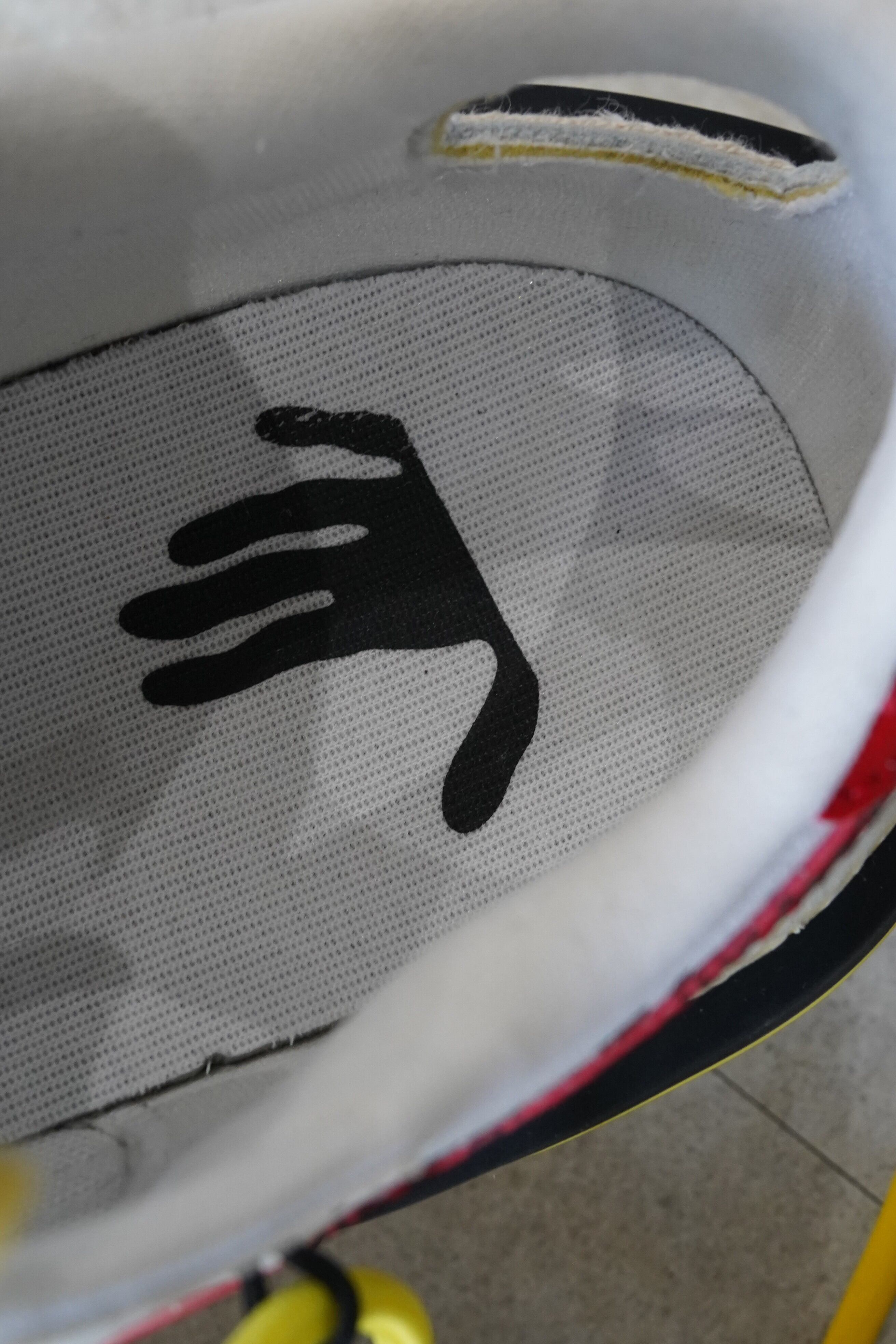 ・ホワイト×イエローのダブルシューレース構造("SHOELACES" テキスト入り)