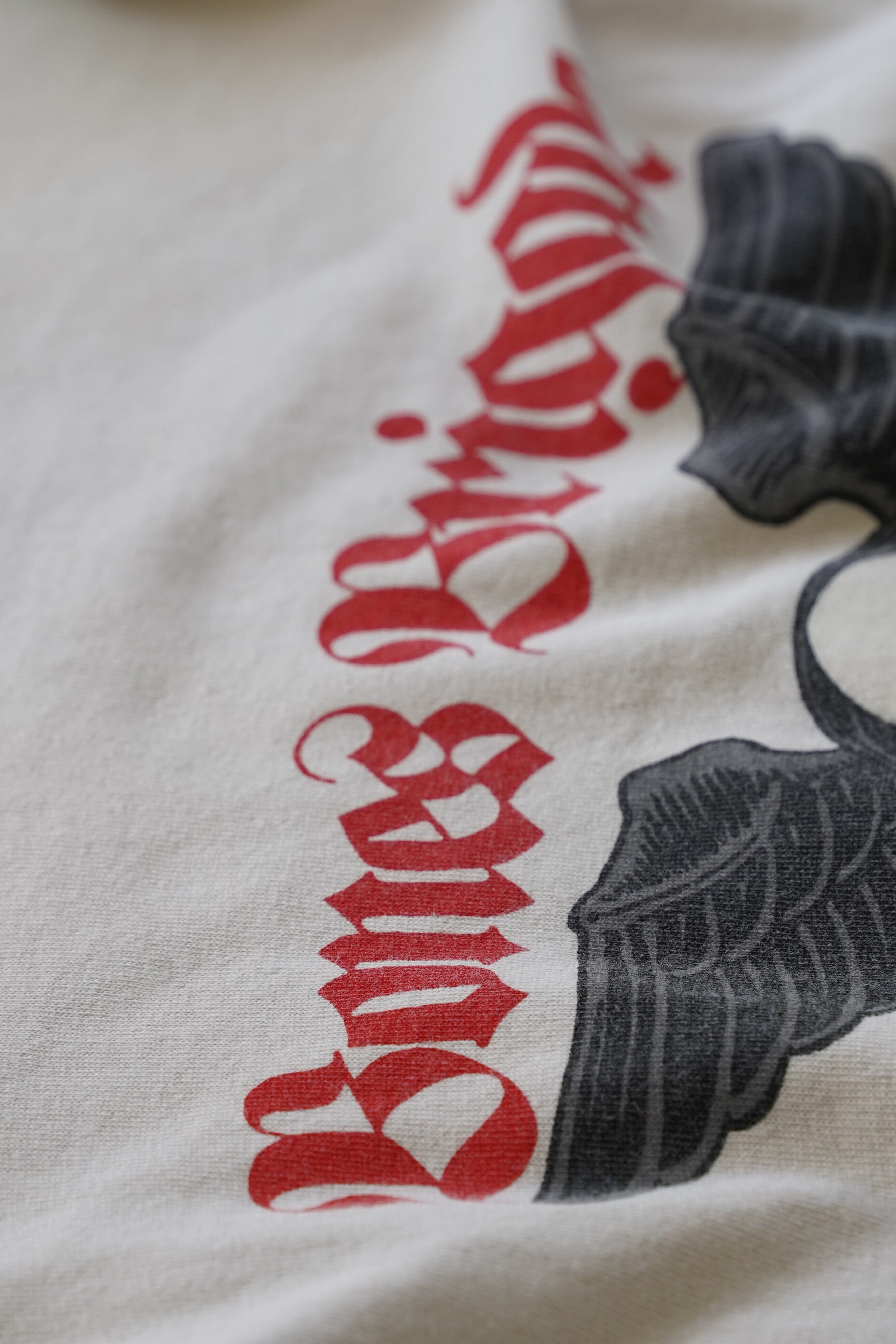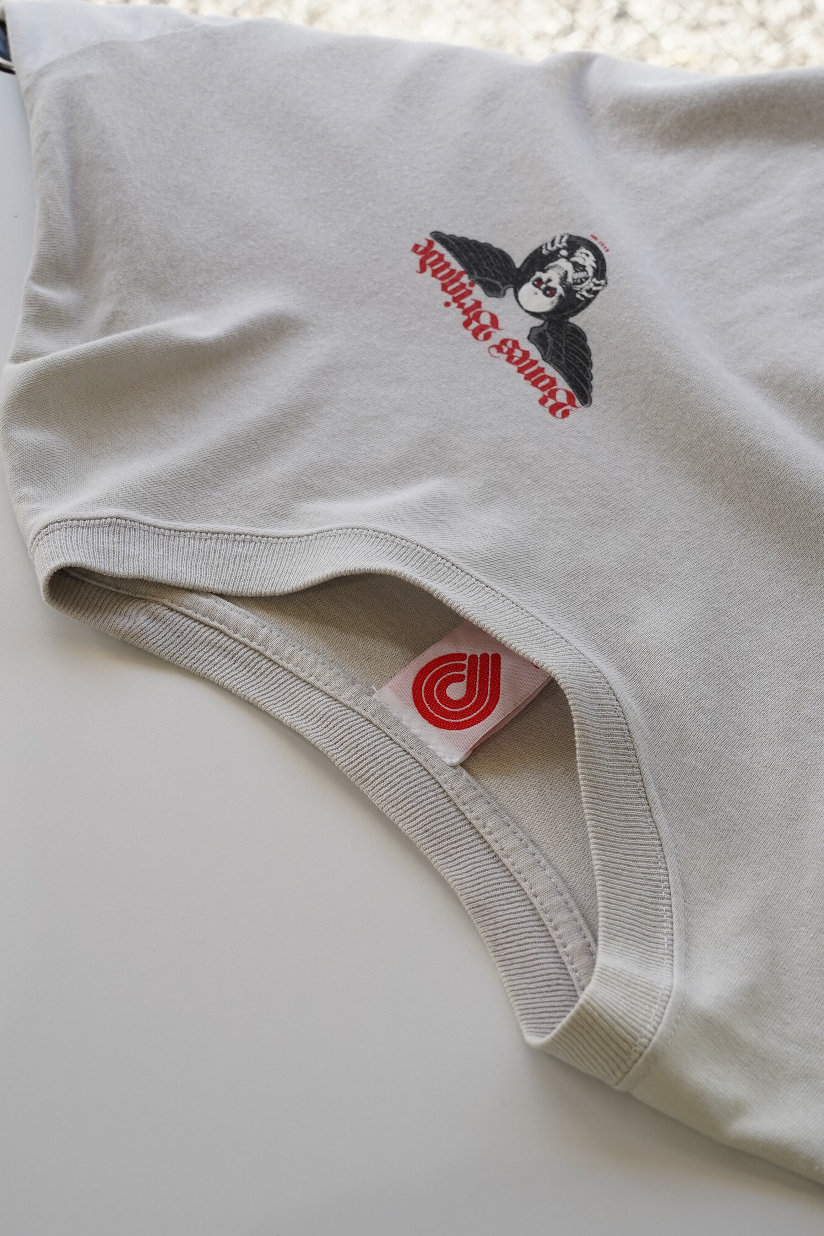少し暖かみも感じる淡いグレーのボディに、象徴的な“スカル&ウィング”が静かに浮かぶ一着。