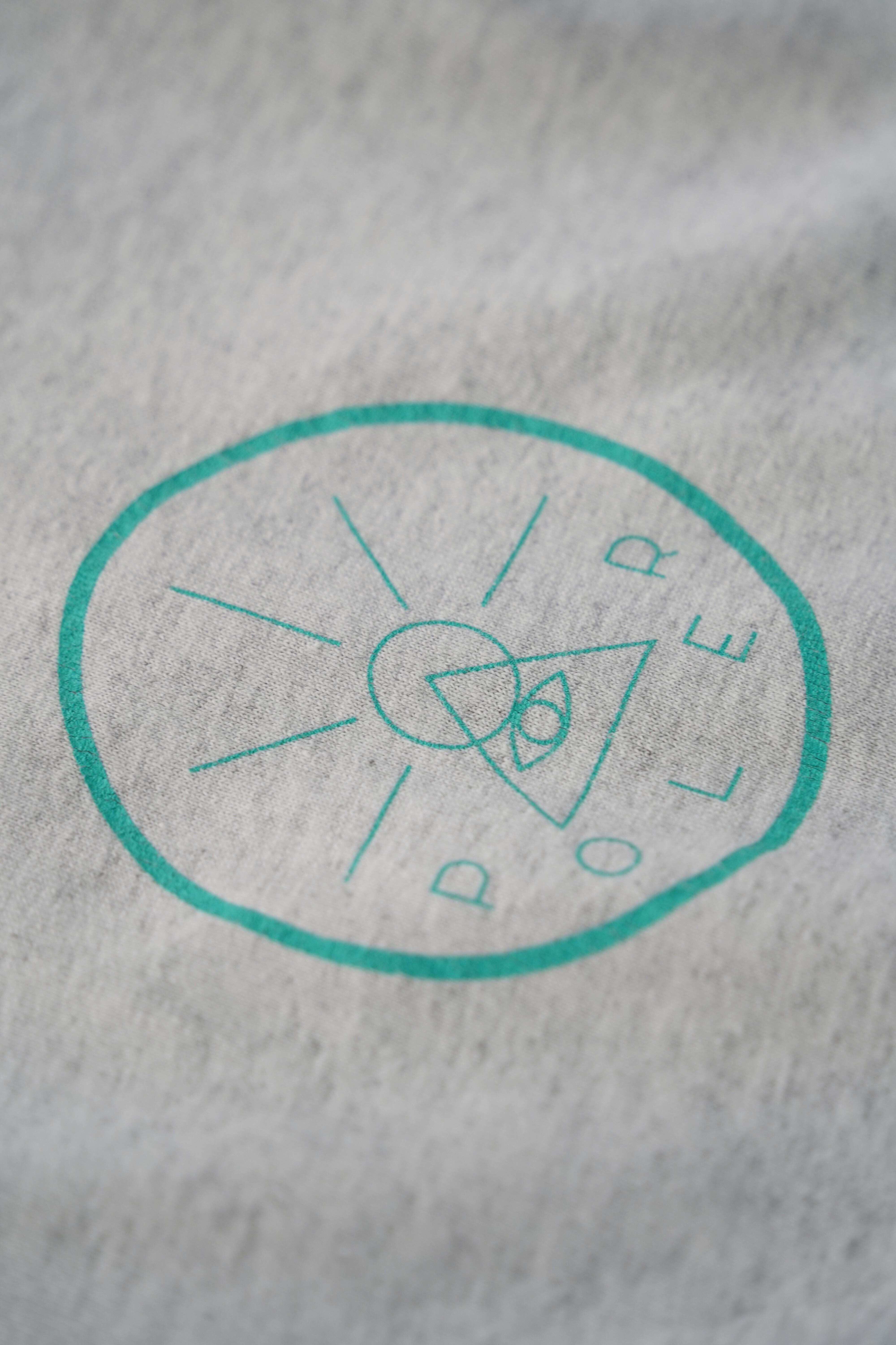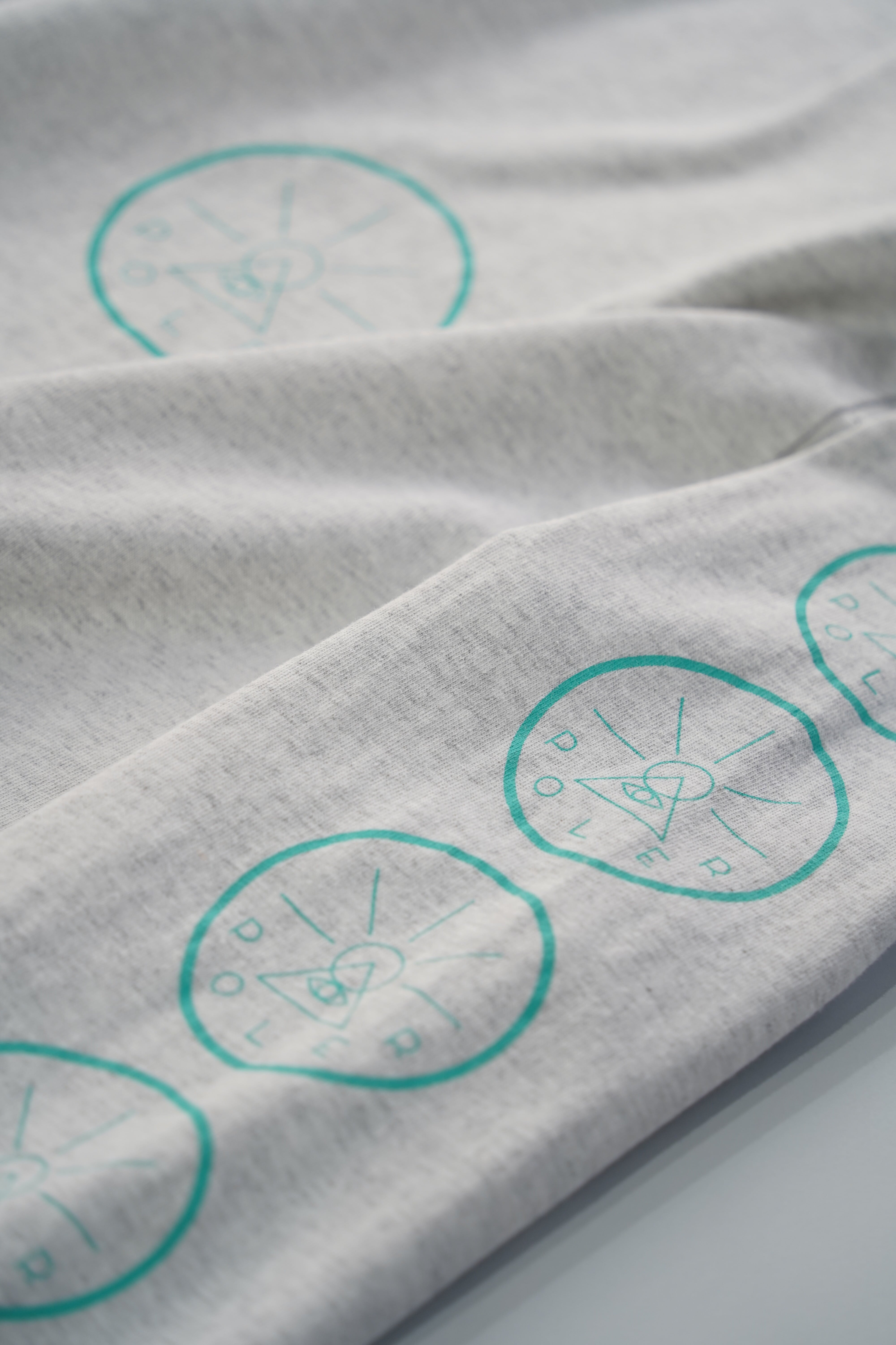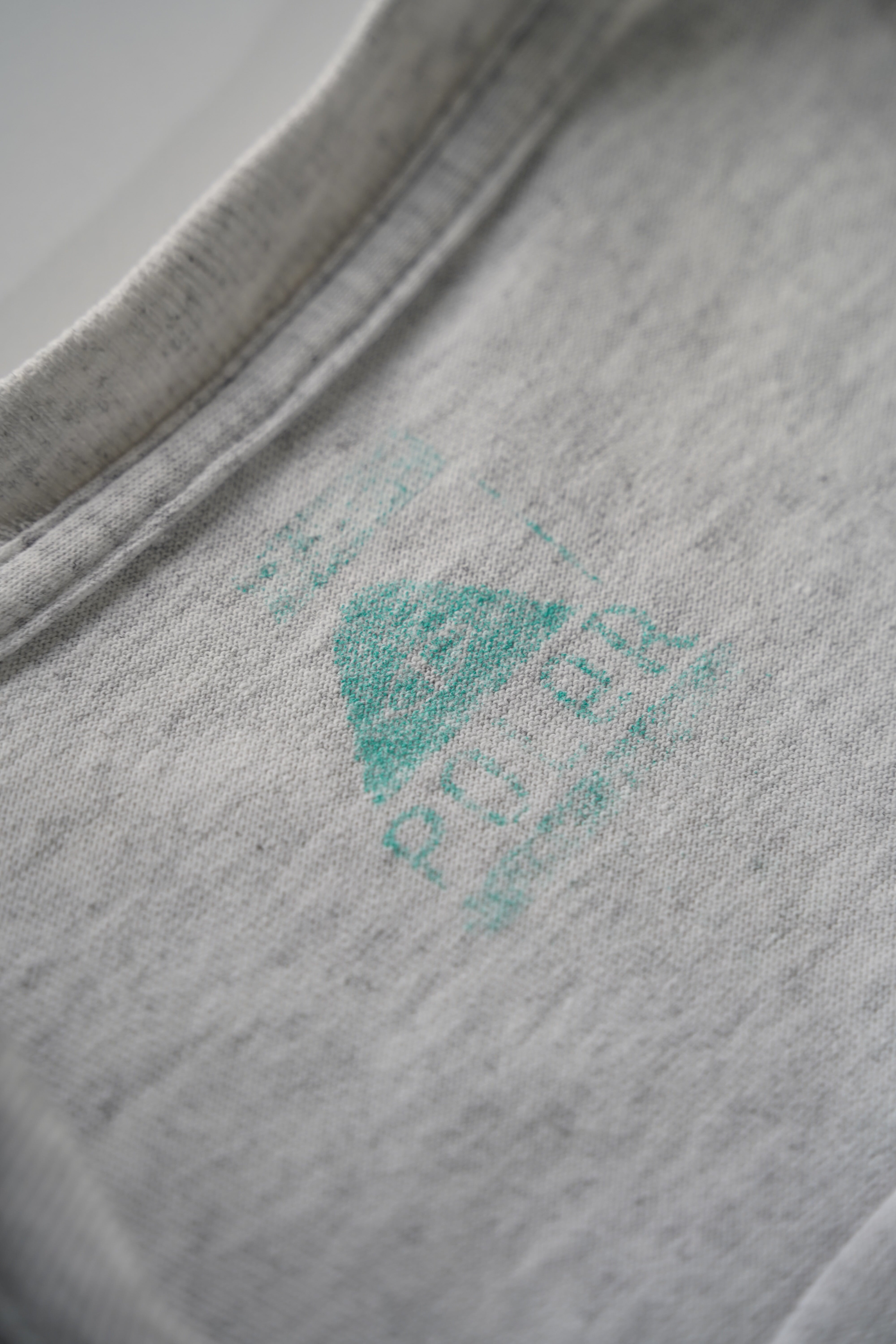 ライトグレーのボディにティールグリーンのカラープリント、袖の両サイドに走る大胆なレター配置。普段着としてもアウトドアにも振れる万能な一枚です。