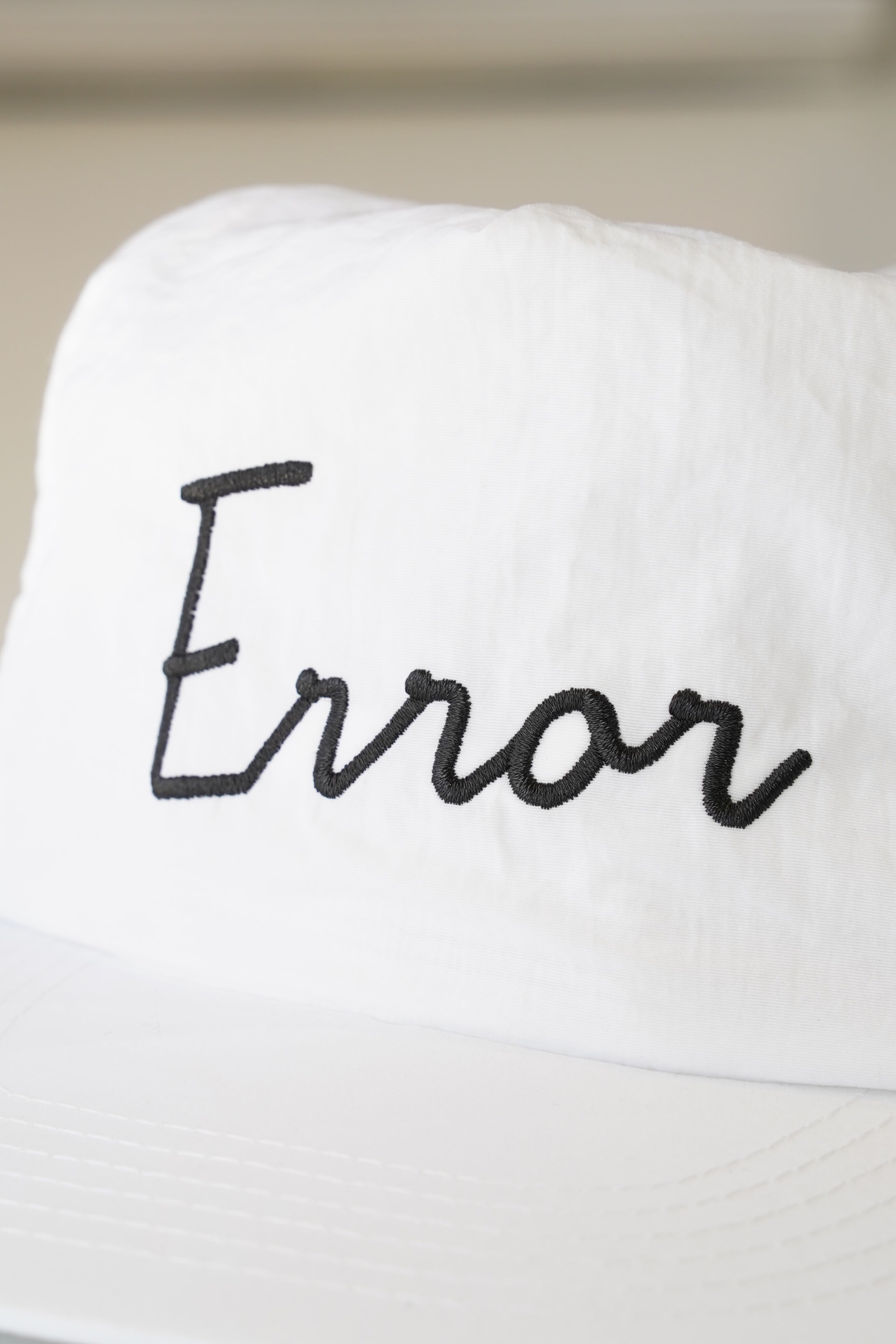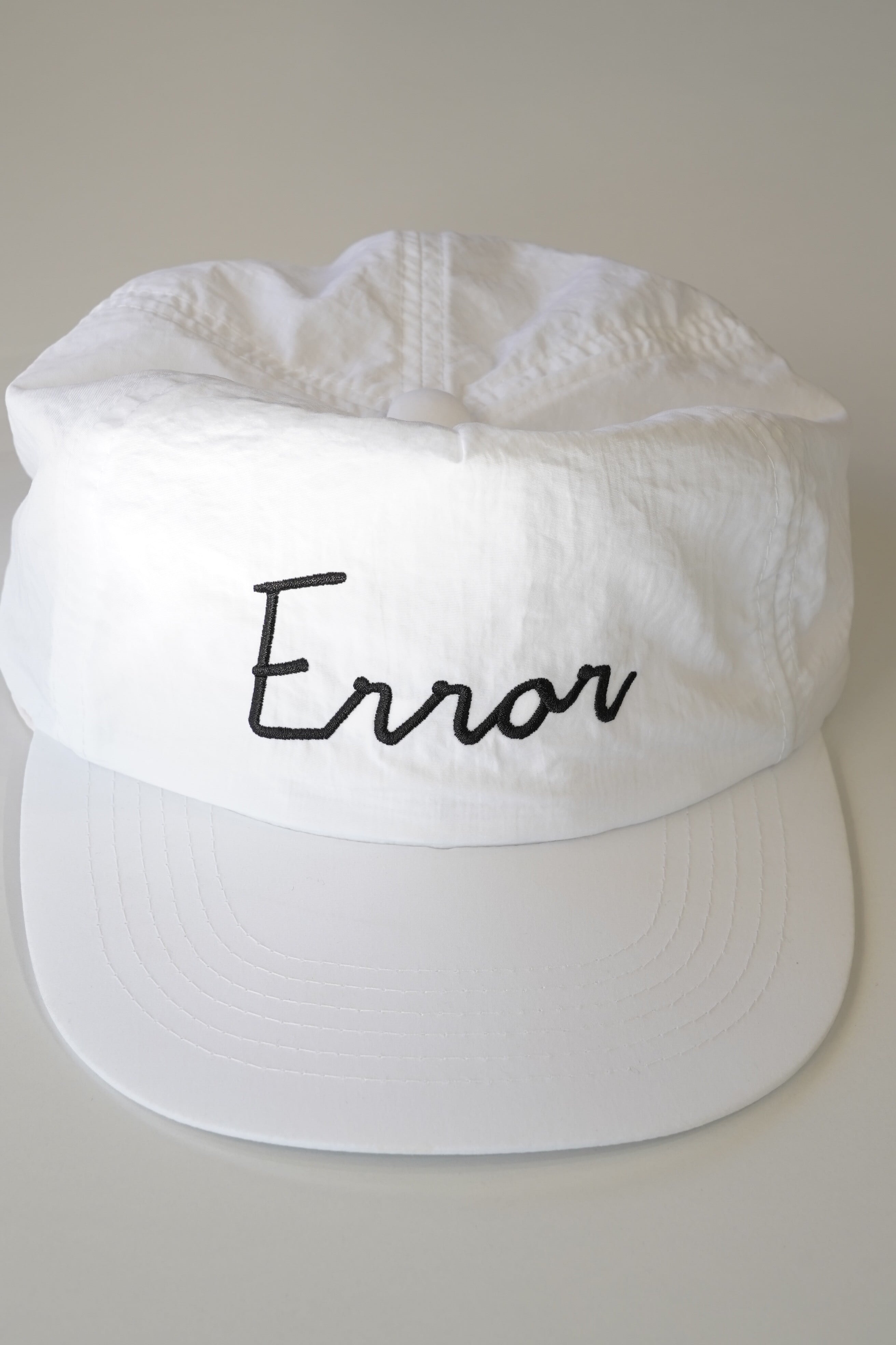 フロントに大きく配置された手書き風の “Error” 刺繍ロゴが際立つ、軽量ナイロンボディの スナップバック仕様・目差し(フロントシールド)付きキャップです。