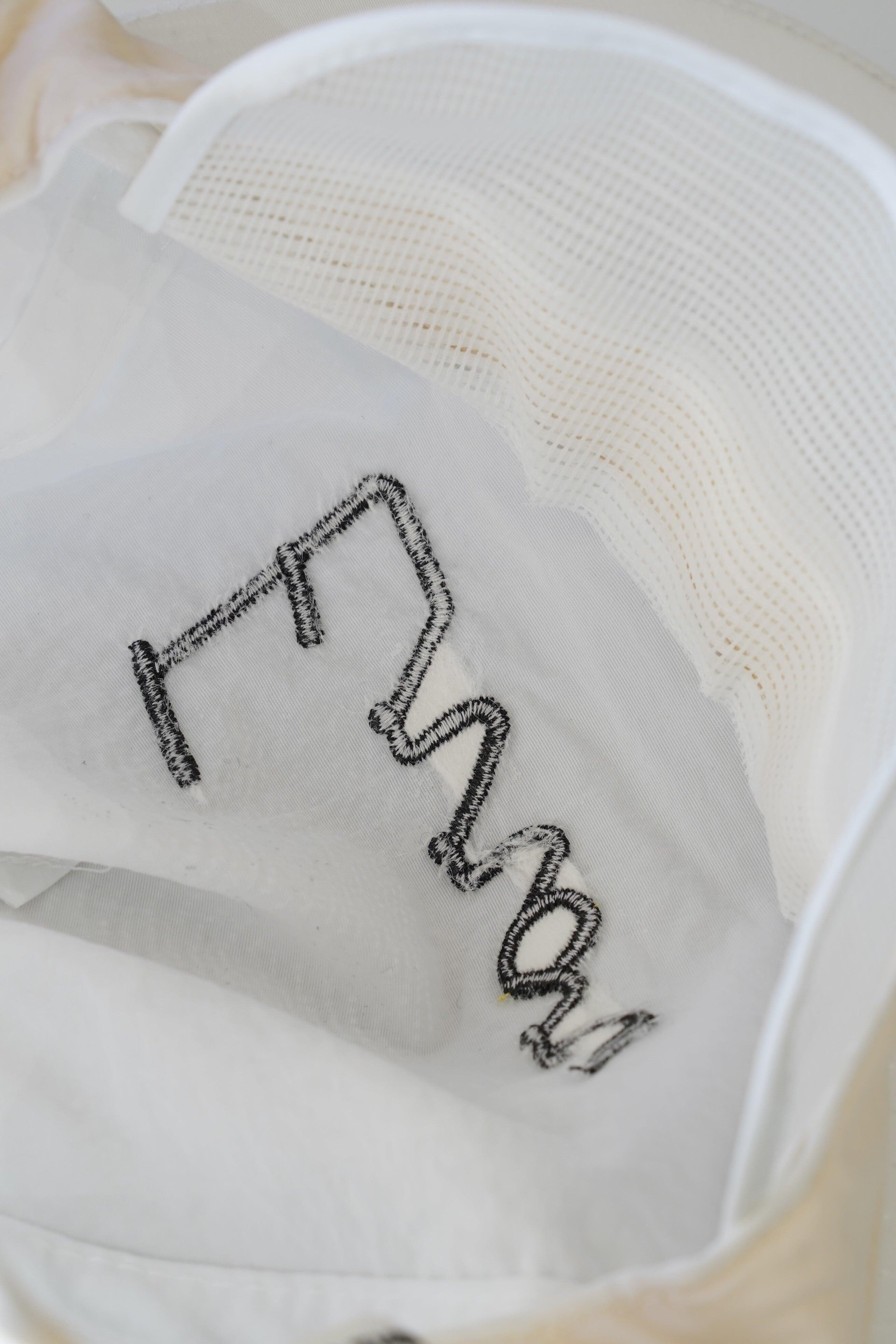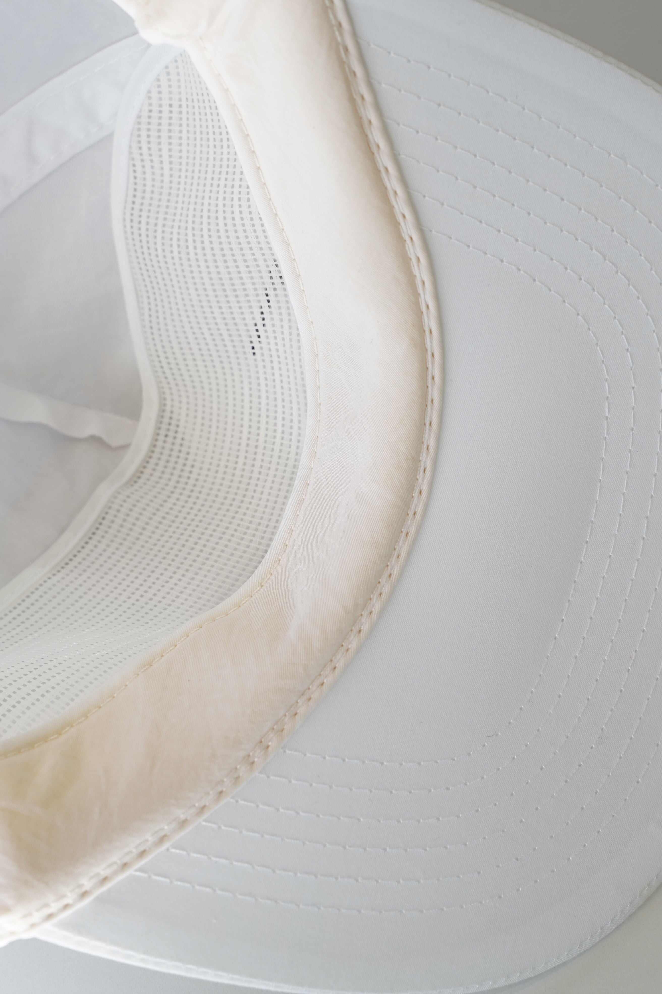 裏側にはメッシュ補強パネルと目隠し用のフロントシールド、内側スウェットバンドは生成り寄りのベージュ。