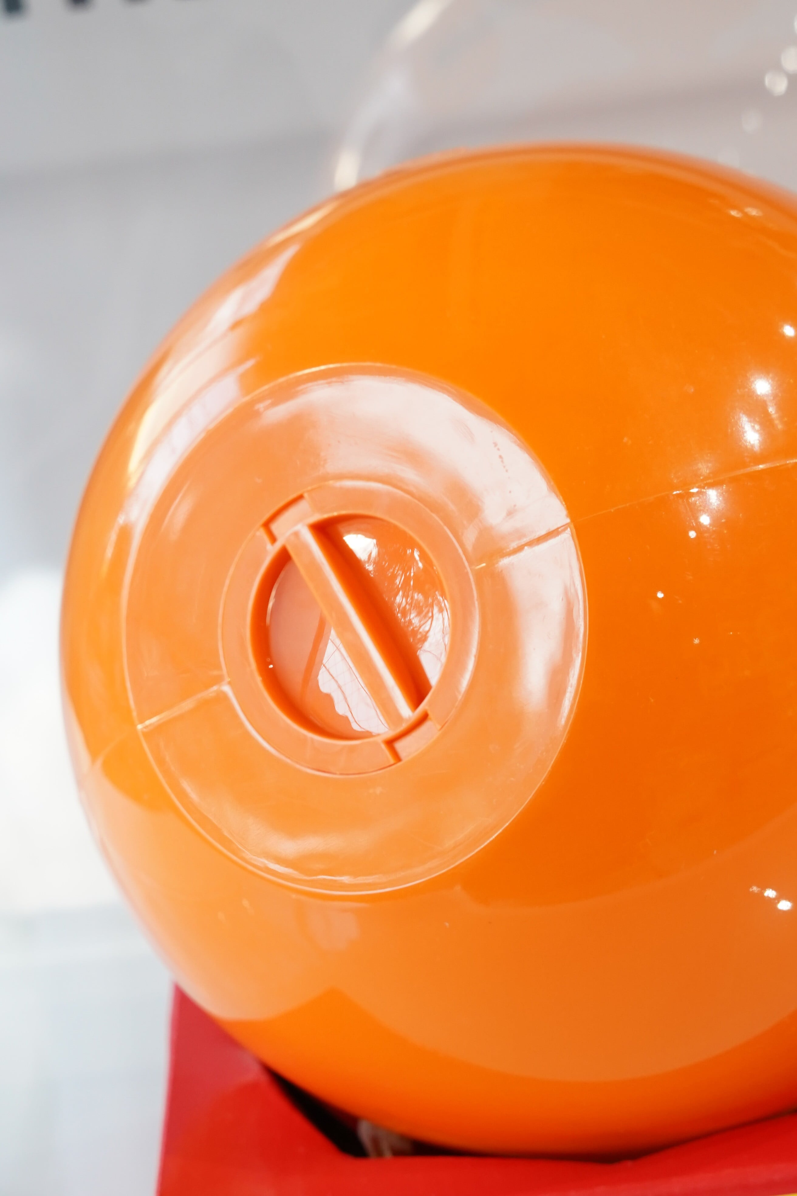 直径約16cmの球体は存在感があり、透明感のある本体越しに見える濃いオレンジの艶と、三星球の赤がきれいに映えます。