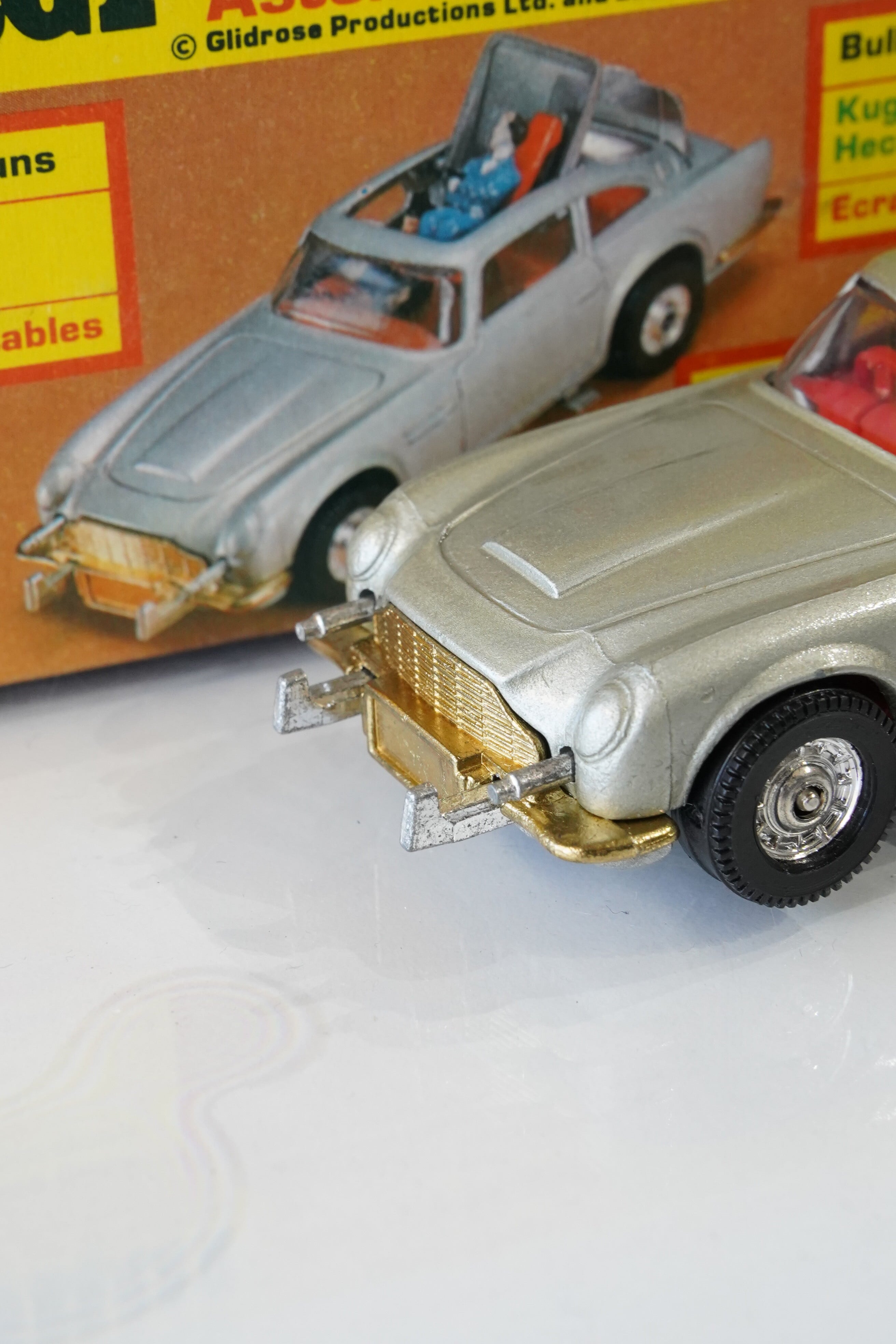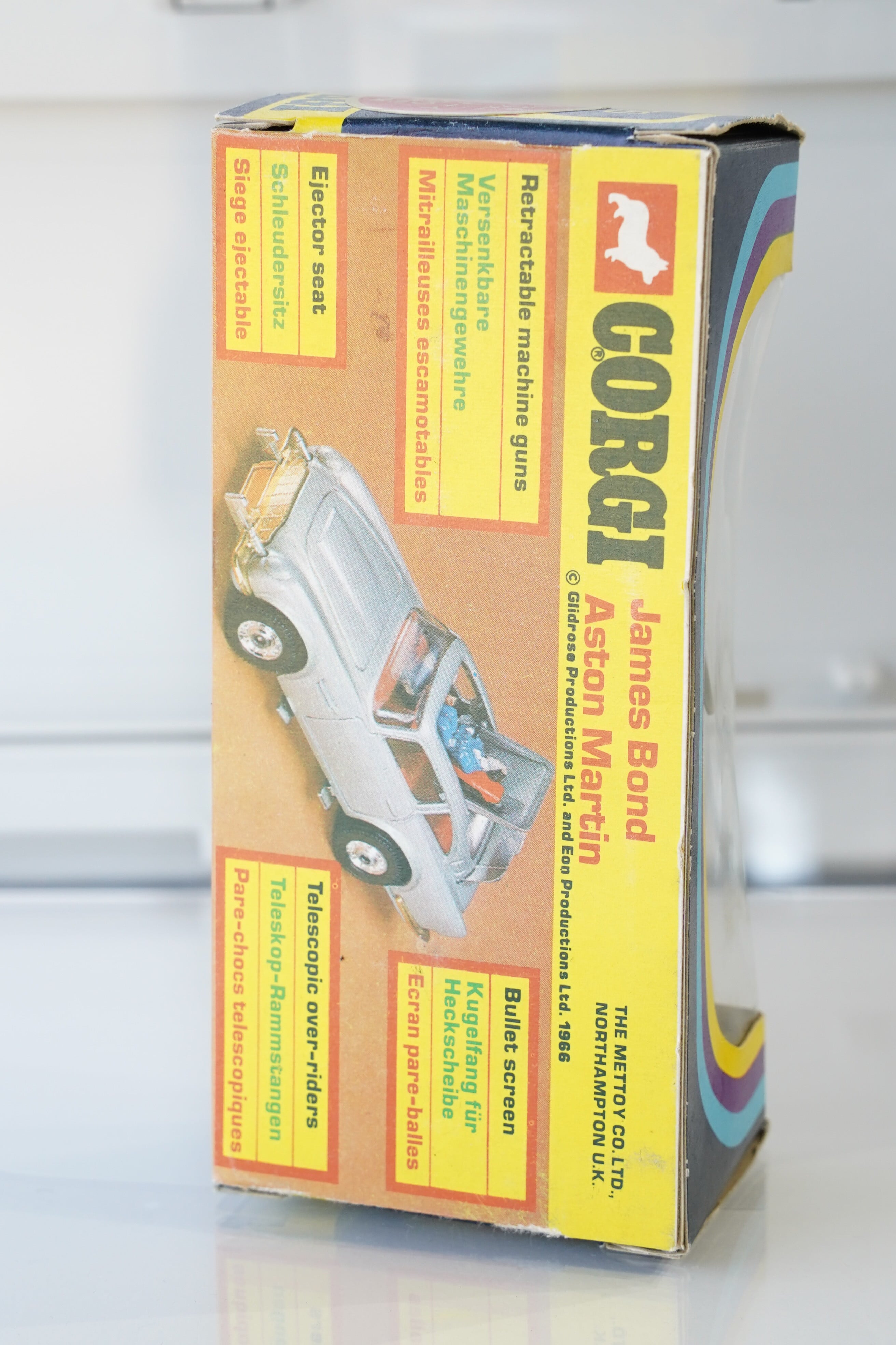 パッケージ裏にはこれらのギミック名が英語・ドイツ語・フランス語で表記されており、CORGIが欧州市場全体に展開していた歴史を示しています。