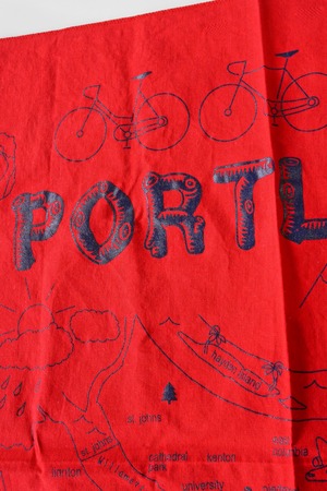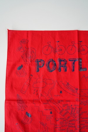 赤地にネイビーの線画で、ポートランドの地図と