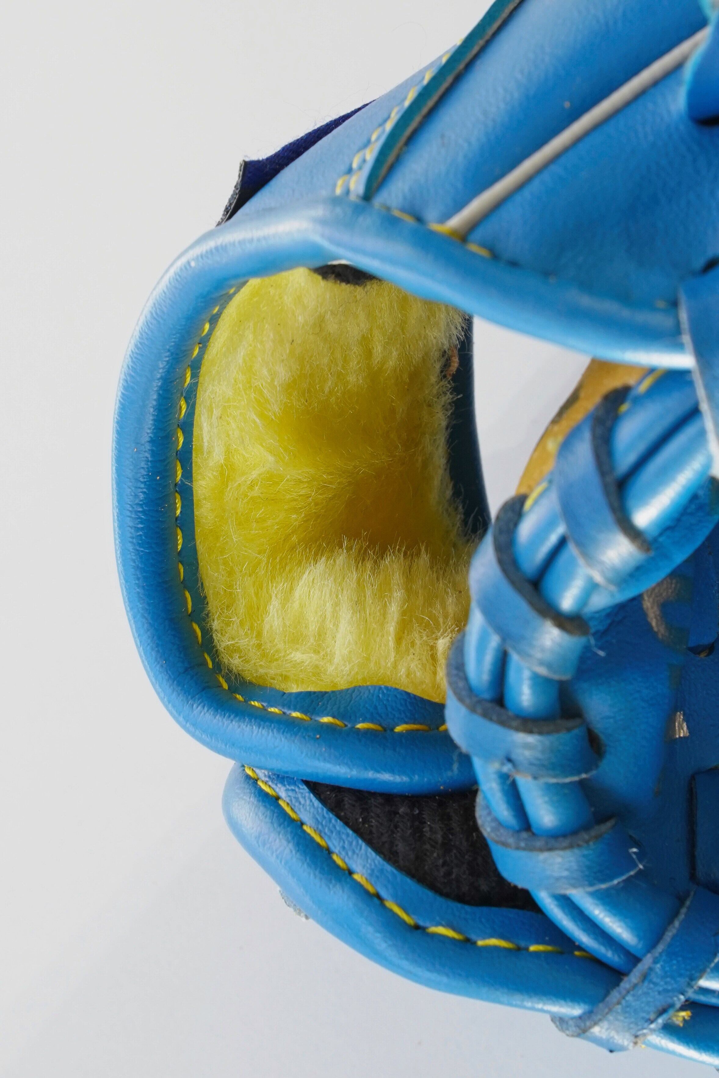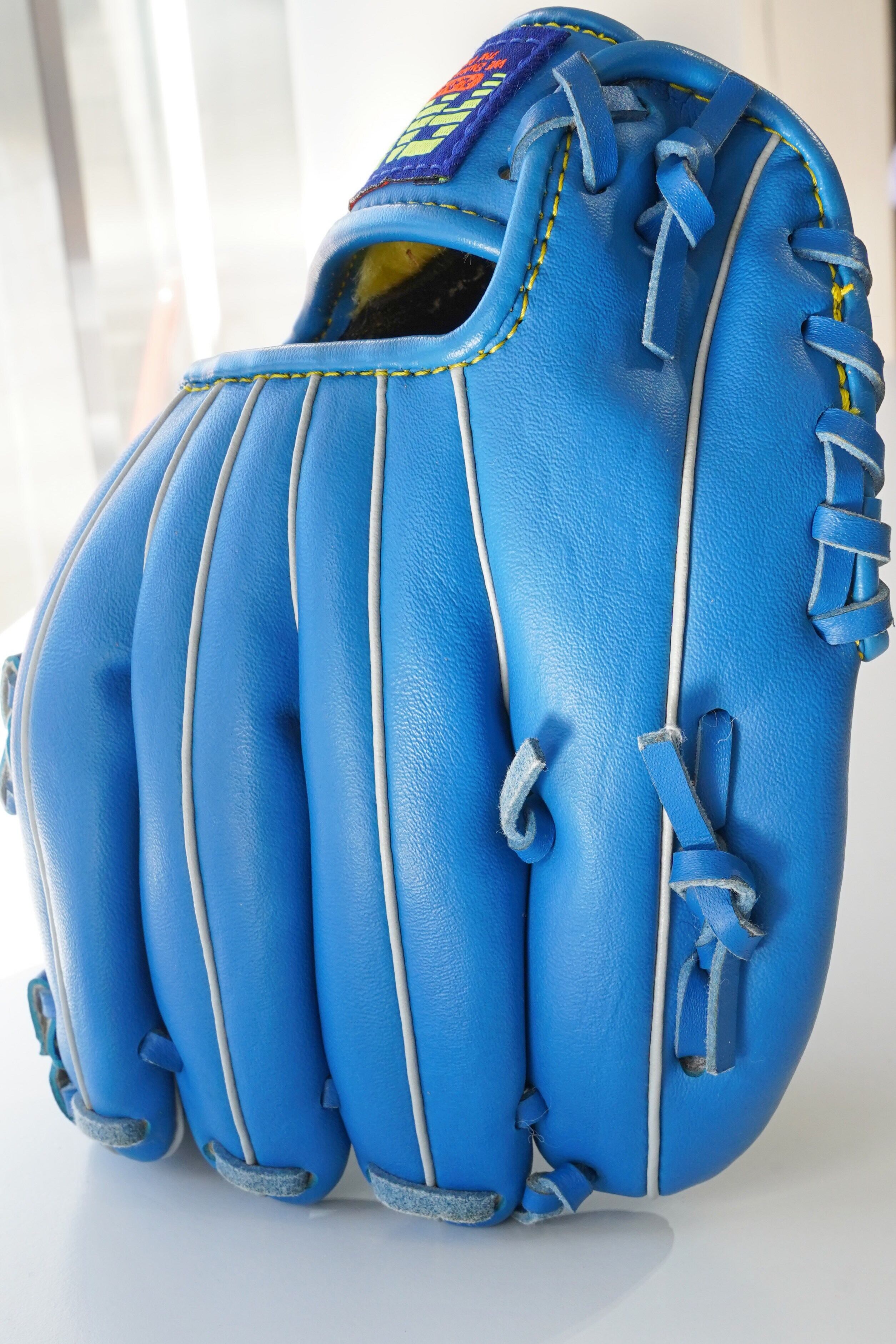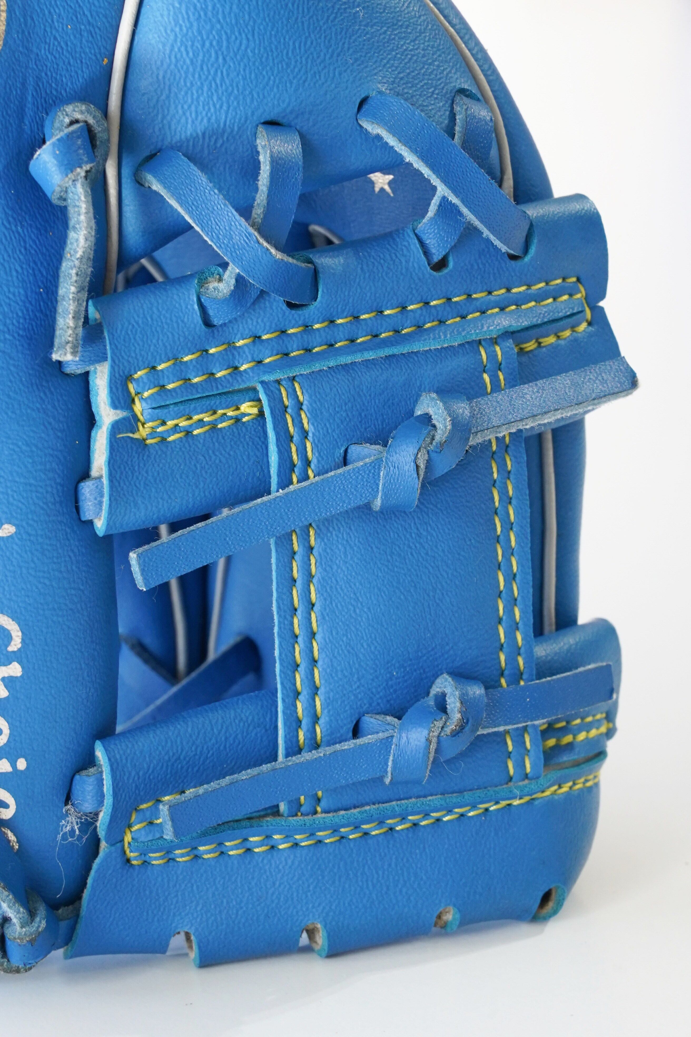 鮮やかなブルーにイエローステッチ。