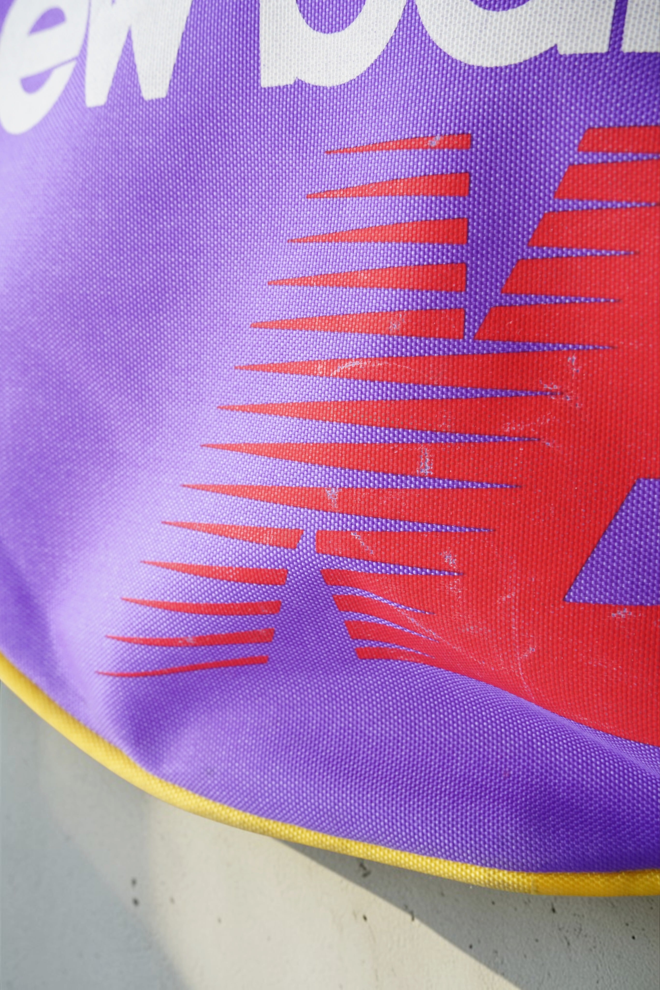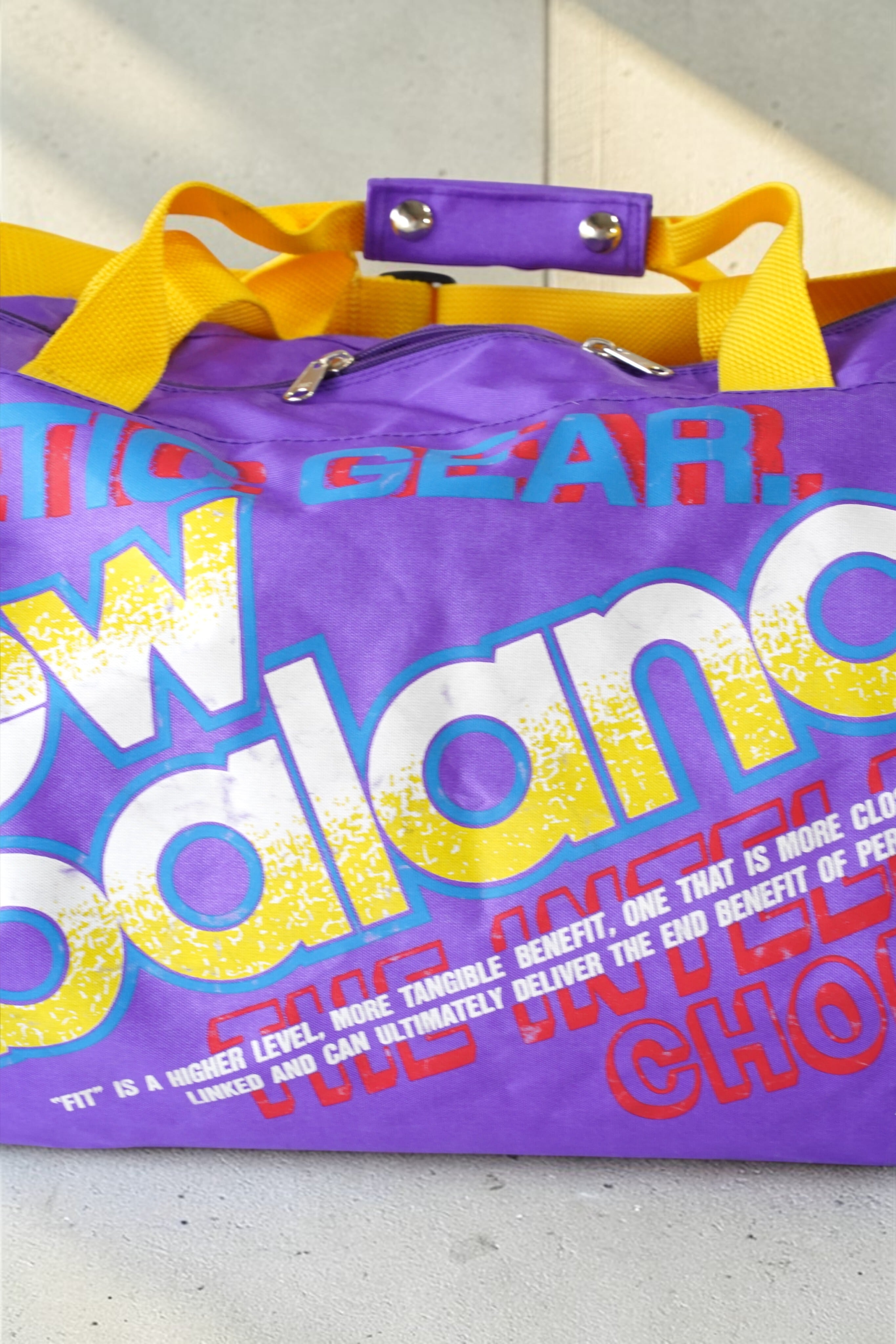 パープル×イエローの強い配色に、レッドやブルーのグラフィックが重なる、90年代らしいスポーツデザイン。