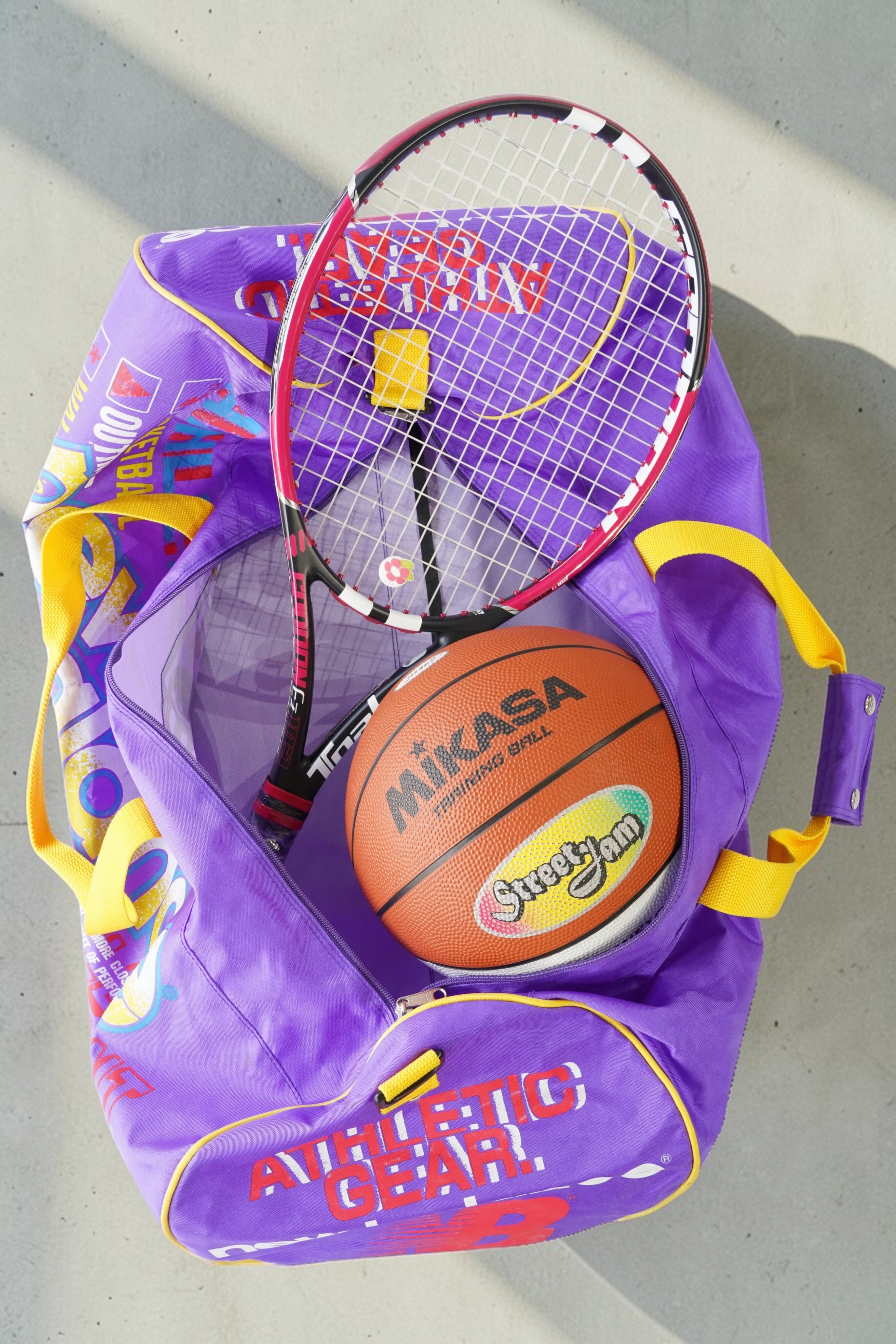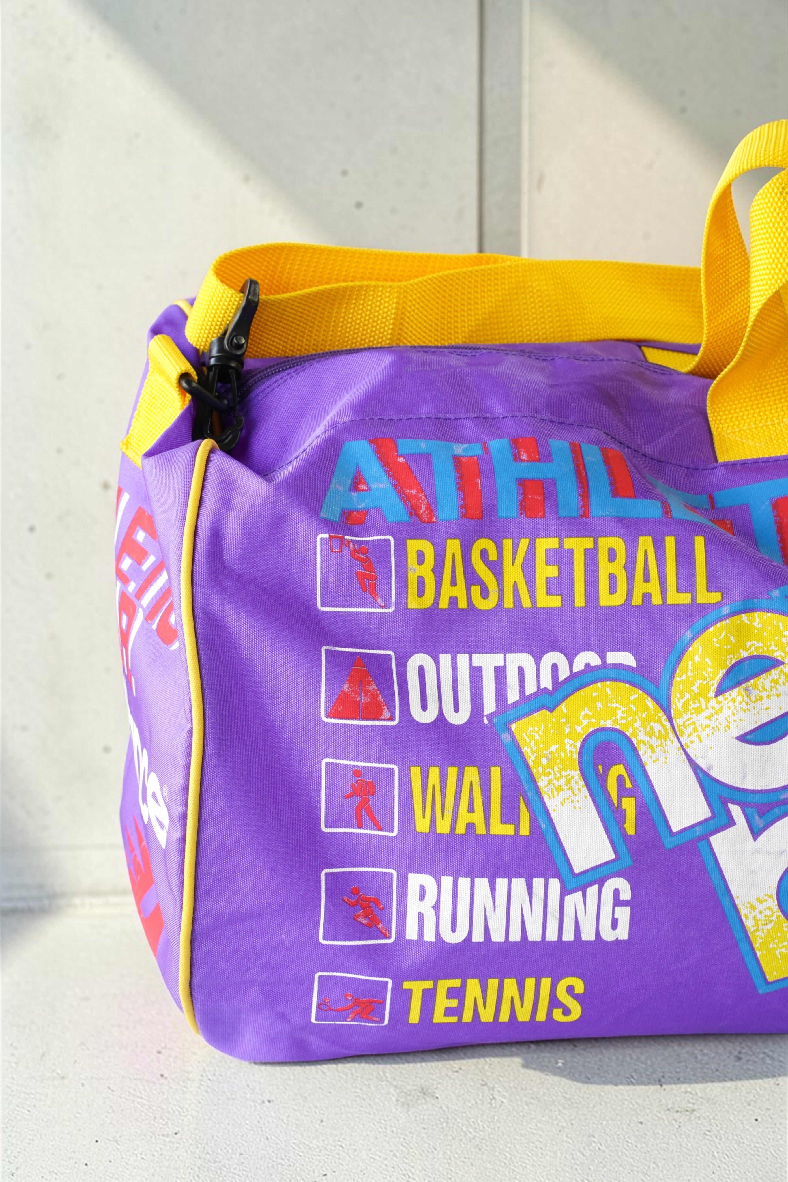 「ATHLETIC GEAR」「BASKETBALL」などのプリントやアイコンが入り、現在のミニマルなバッグにはない“情報量のあるデザイン”が魅力。